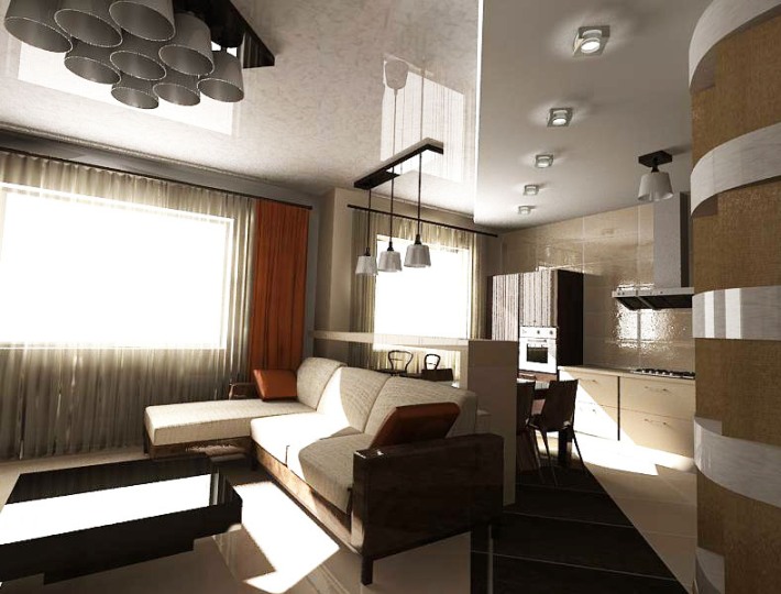 Кухню решено было совместить с гостиной. Разделительной зоной служит барная стойка и диван. Граница кухни и прихожей четко обозначена закругленным выступом стены. В эскизах это выглядело следующим образом.