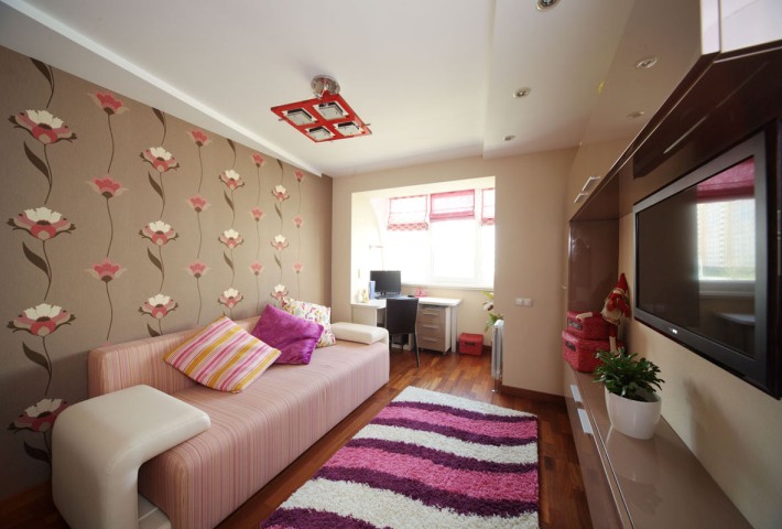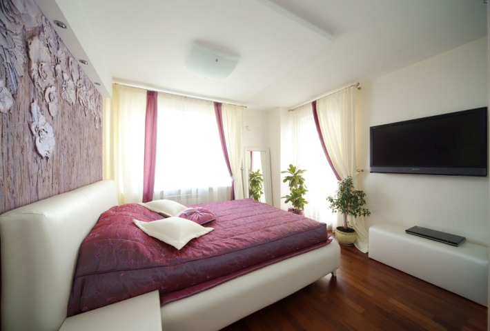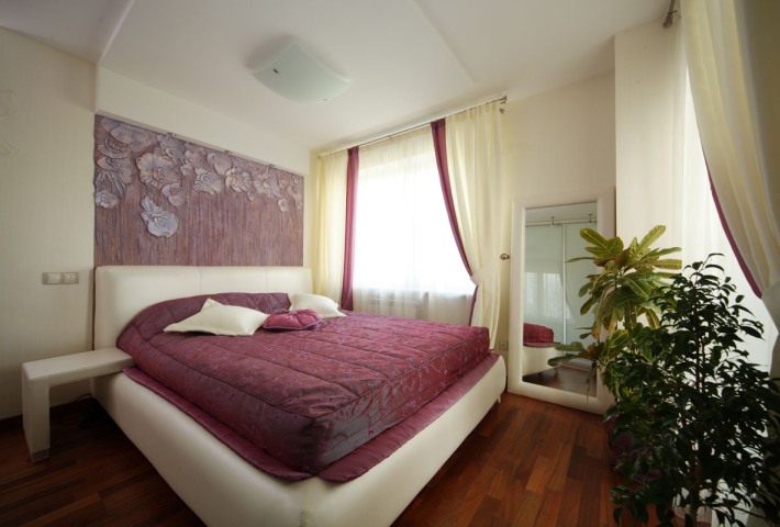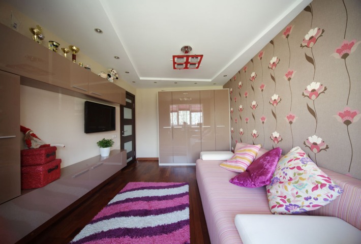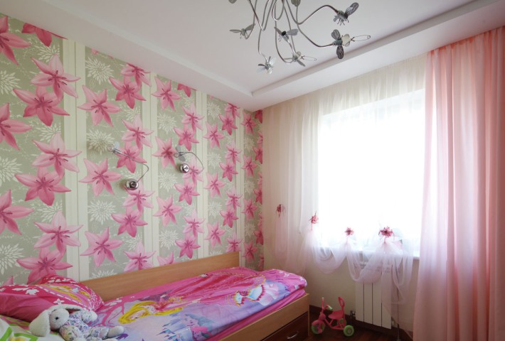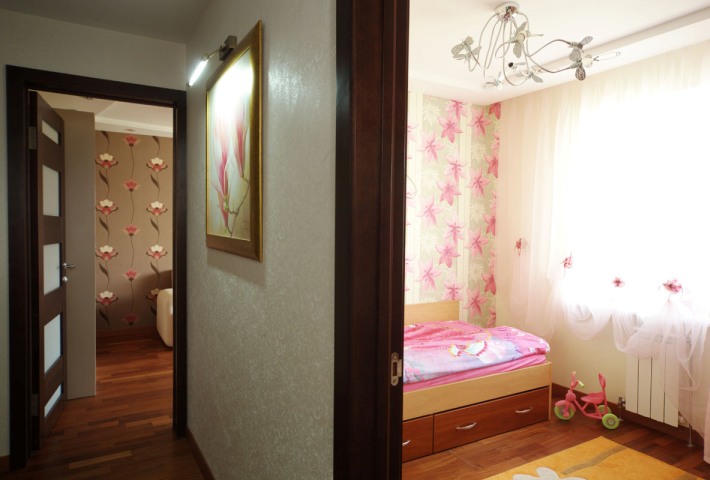 Перед дизайнерами стояла задача сделать трехкомнатную квартиру четырехкомнатной. Общая площадь 106 кв. м позволяла провести перепланировку. Размеры будущей спальни и еще одной комнаты уменьшили, но объединили последнюю с балконом. Таким образом удалось «вклинить» между этими комнатами еще одну — площадью 10 метров. Приводим фотографии спальни и двух детских.