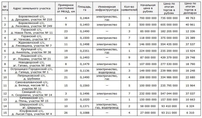 Наиболее острая борьба развернулась за участок площадью 14,9 сотки в агрогородке Лошаны, на который подали заявления 9 человек. В ходе торгов лот подорожал более чем в 5 раз: с 87 до 439 млн рублей (до $29 748 по курсу Нацбанка). Участок не обеспечен коммуникациями и находится в районе новой застройки в 19 км от МКАД (молодечненское направление). Также 9 человек претендовали на земельный надел площадью 14,9 сотки, расположенный возле леса в деревне Ляховщине (11 км от МКАД в раковском направлении). Этот лот подорожал почти в 4 раза: со 146 до 554,4 млн рублей (до $37 537).