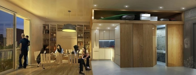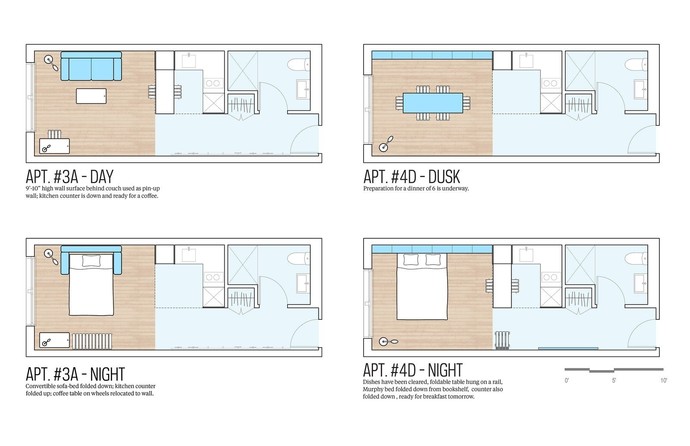 Для снижения себестоимости строительства архитекторы nArchitects спроектировали дом панельно-блочным — состоящим из однокомнатных квартир-блоков, которые собираются на заводе железобетонных изделий. Около 20% дома предусмотрено под общественные помещения — предполагается, что жильцы будут принимать гостей в специальных гостевых игровых комнатах, доступ в которые обеспечивается по предварительной заявке.