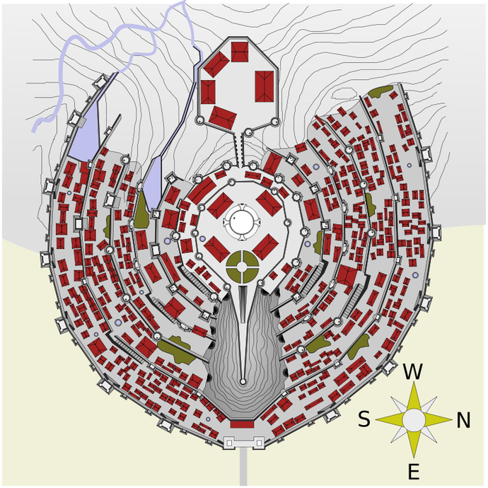 Минас-Тирит — столица Гондора, одного из государств Средиземья во вселенной Дж. Р. Р. Толкина «Властелин колец». Город-крепость был выстроен на отроге горы Миндоллуин и расположился на семи террасах, каждая из которых была обнесена стеной с воротами. На верхней террасе стояла Белая башня. Считалось, что крепость, построенная из нуменорского камня с ее воротами из мифрила, «серебряной стали», абсолютно неприступна. Пока неясно, где авторы проекта по возведению копии Минас-Тирита собираются взять нуменорский камень и где они раздобудут необходимый для ворот мифрил.