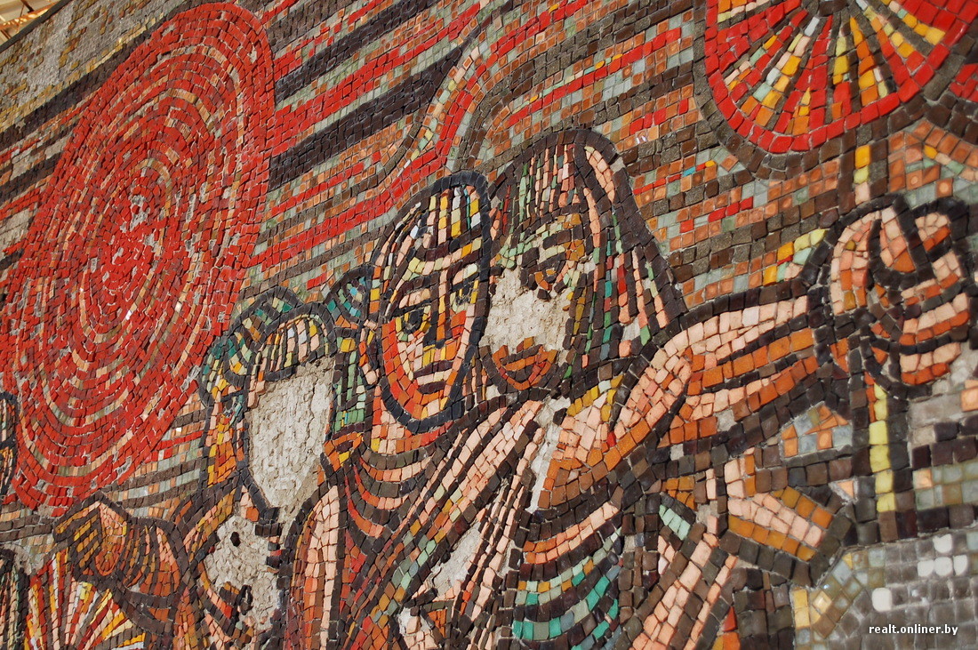 Внешняя круговая галерея, опоясывающая основной зал, была украшена 14 мозаичными сюжетами соц-арта.