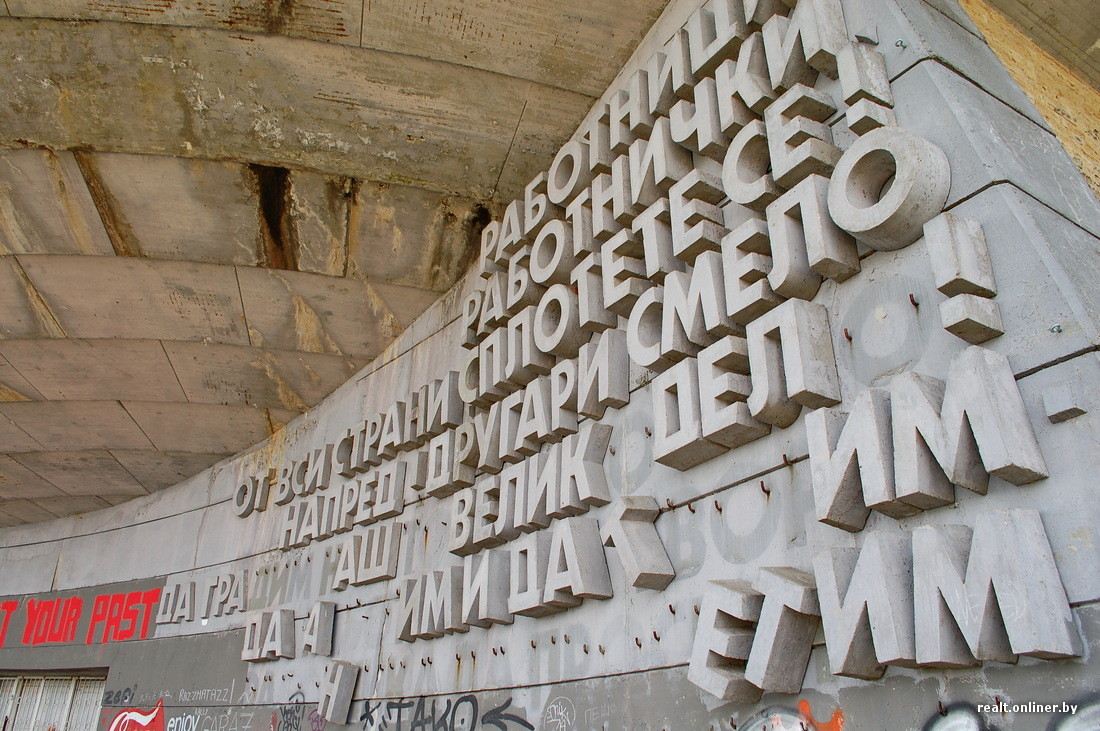 С обеих сторон от заваренного ныне главного входа рельефными буквами на болгарском языке вписаны стихи из «Интернационала».