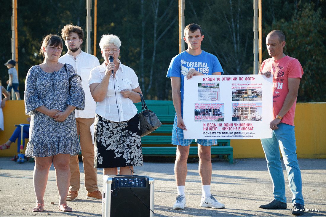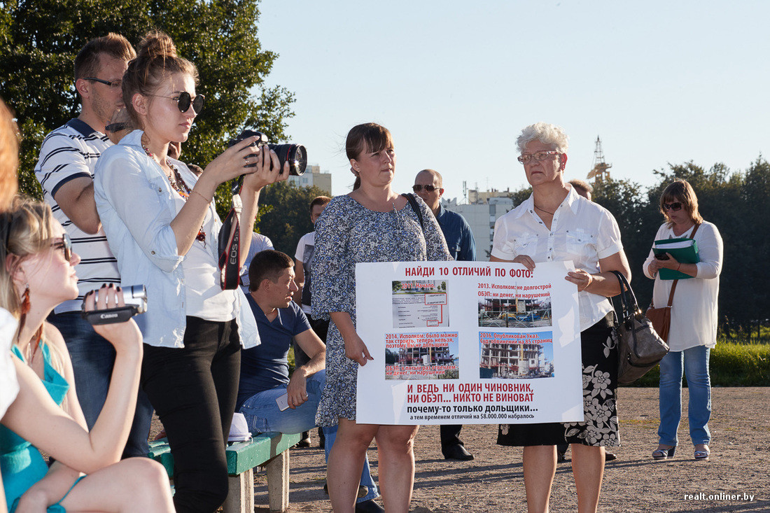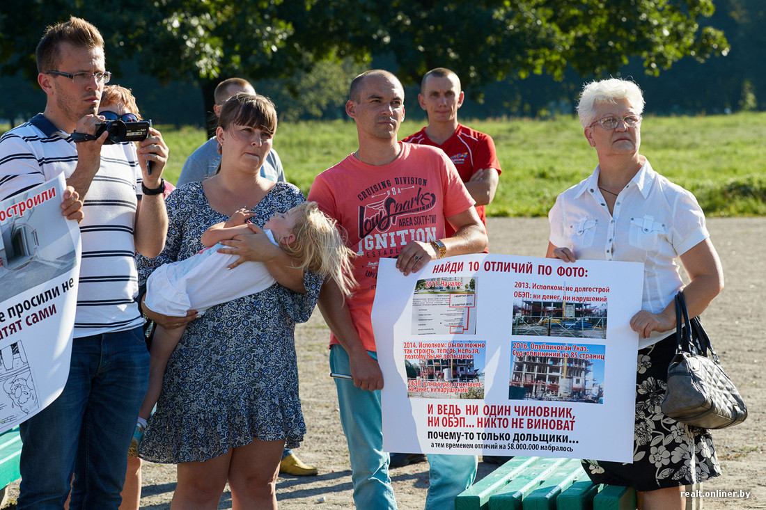 Истории обманутых минчан, вложившихся в долевое строительство, постоянно появляются в СМИ. Можно записывать видеообращения, воевать с застройщиками в судах, но через пару месяцев истории повторяются: недоделки, упрощение первоначального проекта и, конечно, отложенная на неизвестный срок сдача дома. Инициативная группа минчан, объединившихся под названием «Обманутые дольщики», решила: ситуацию надо исправлять. Люди собрались на митинг в парке Дружбы народов — первое подобное мероприятие, согласованное с Мингорисполкомом.