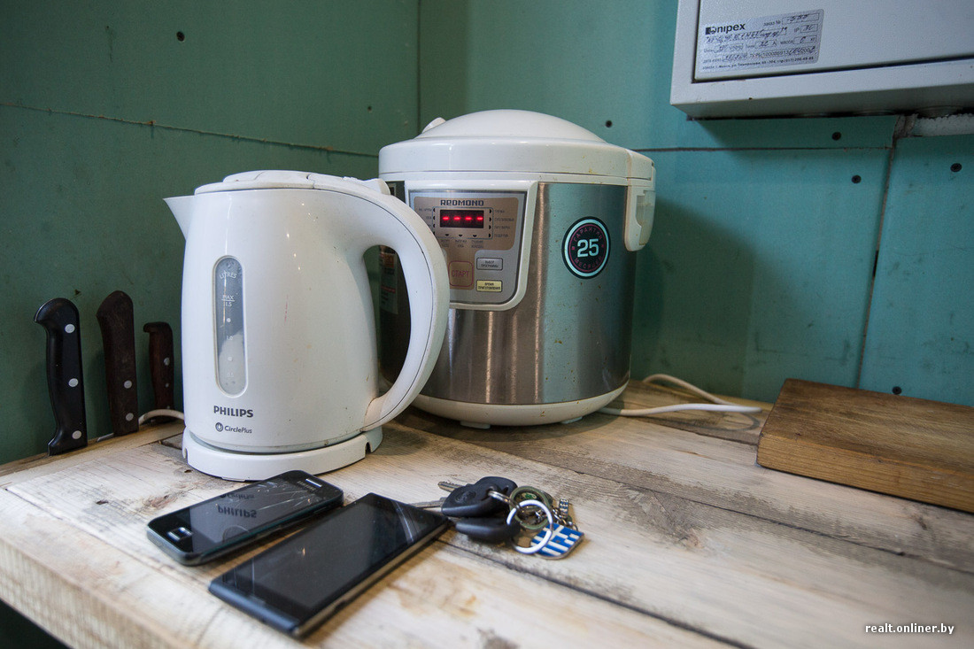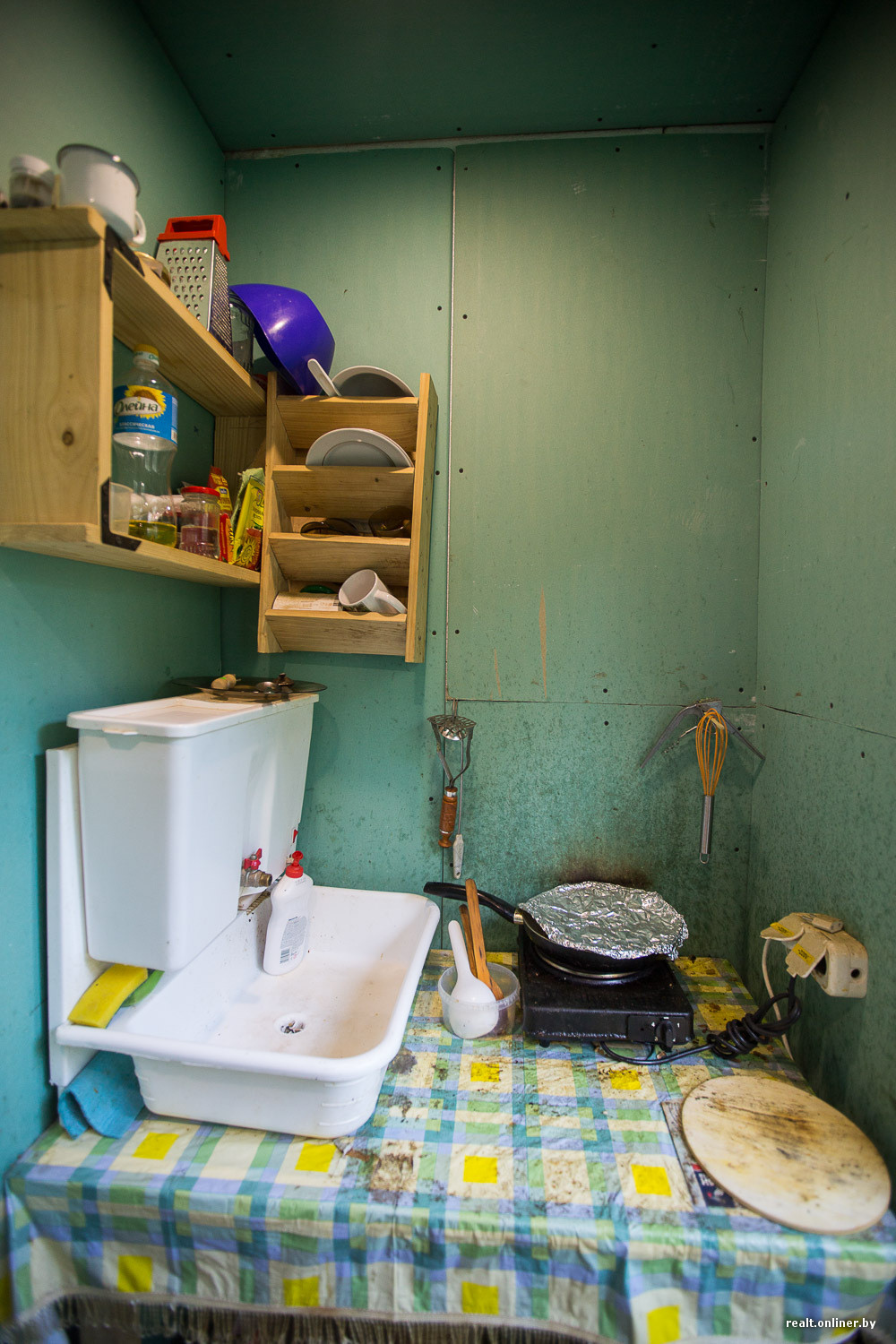 За коммунальные услуги парень платит всего около 5 рублей в месяц — столько тянут чайник и небольшая электроплита. Недавно установил умывальник, а вот душ построить пока не успел — приходится ездить к родственникам или в банный комплекс в Смолевичи. А первое время у Андрея не было и таких удобств, даже еду приходилось готовить на костре во дворе. С переездом к нему девушки он смастерил полочки для посуды, постелил ковер, сделал несколько стульев.