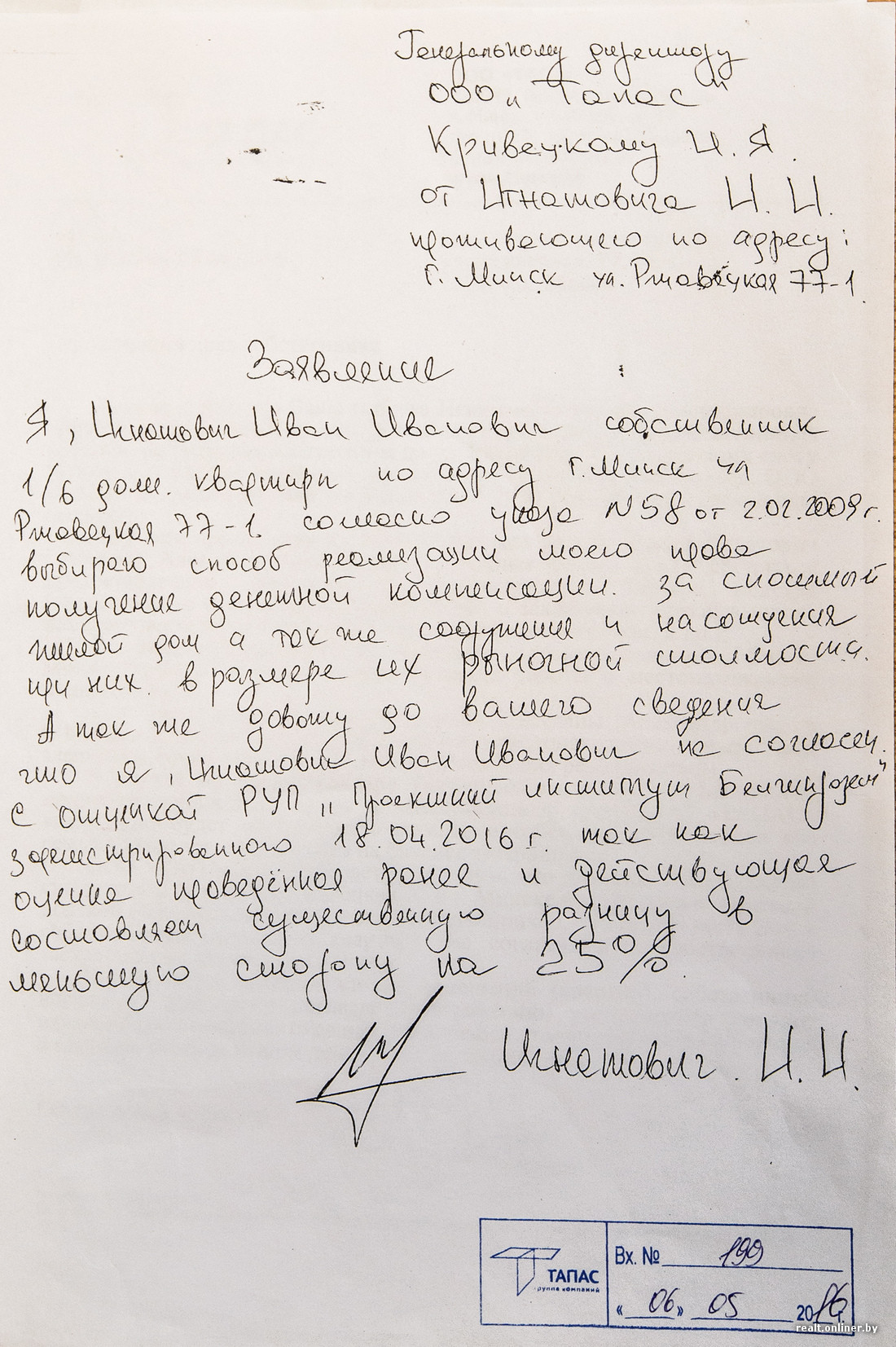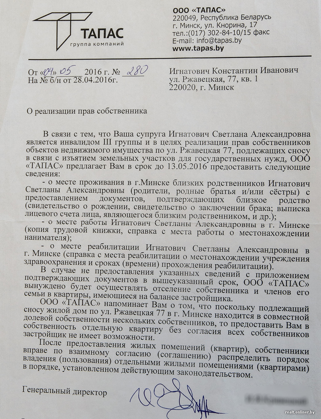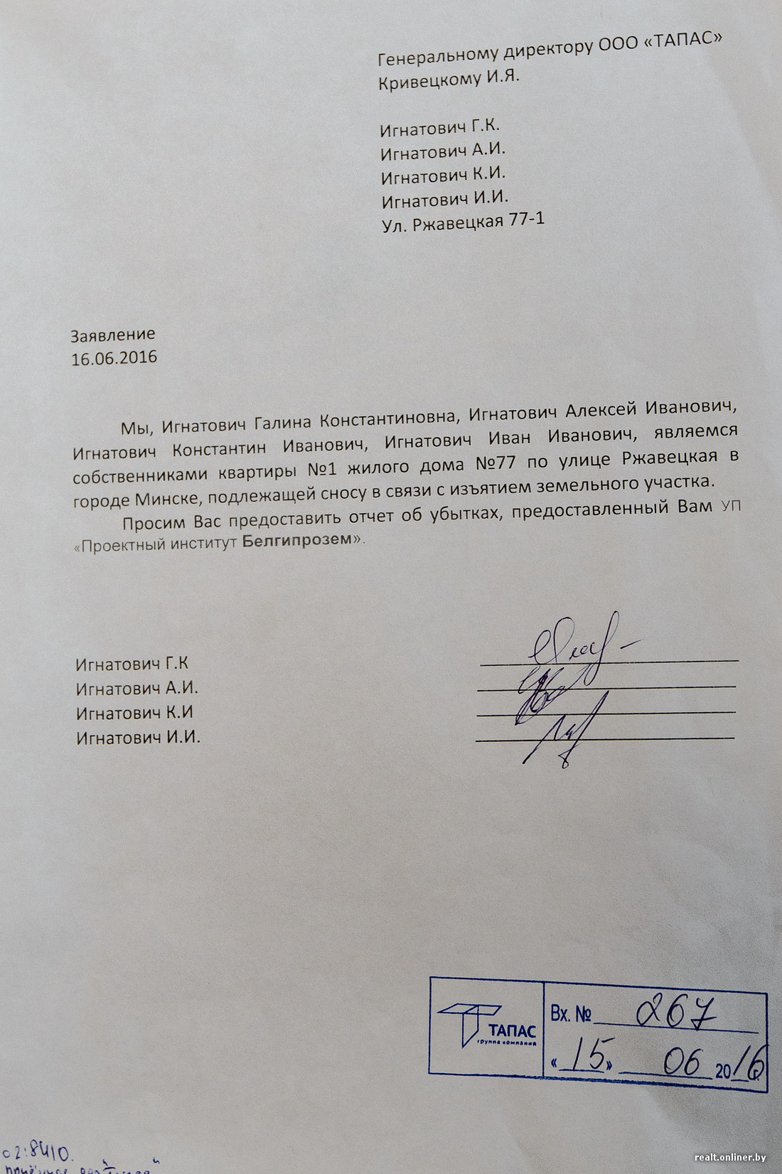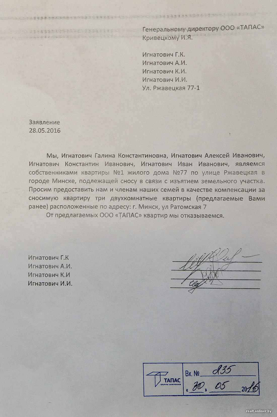 30 мая 2016 г. мы обратились в «Тапас» с заявлением о том, что в качестве компенсации просим предоставить три двухкомнатные квартиры в «Браславском», — как мы раньше и договаривались. Но ответов так и не последовало. После того как 22 августа дорогу к нашим домам перекрыли бетонными блоками, с нами все-таки встретились представители компании «Тапас». Им мы и высказали наши пожелания: предоставить три двухкомнатные квартиры по ул. Ратомской, 7 или три двухкомнатные квартиры в других новостройках Центрального района. В качестве альтернативы предложили еще такой вариант — двум собственникам, Галине Игнатович и Ивану Игнатовичу, предоставить денежную компенсацию в размерах, соответствующих стоимости их долей в квартире, а остальным двум собственникам (Константину и Алексею Игнатовичам) и членам их семей предоставить не менее 120 м2. Очень важно понимать, что мы просили один из видов компенсации — мы же не сумасшедшие за один дом общей площадью 130 квадратных метров и жилой — 80 просить все и сразу.