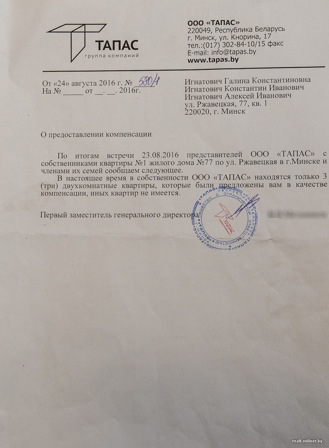Беря во внимание текущие условия проживания Игнатовичей, предлагаемый застройщиком вариант компенсации значительно улучшит их уровень жизни, но собственники рассчитывают на то, что смогут получить из данной ситуации, к которой готовились несколько лет, гораздо больше. Также важно отметить, что по законодательству «Тапас» имеет право предоставить Игнатовичам одну квартиру общей площадью не менее 150 кв. м, что было бы для нас гораздо проще, но, учитывая их семейные обстоятельства, когда 3 семьи из 10 человек проживают на 80 жилых кв. метрах, мы идем гражданам навстречу и выполняем их ключевой запрос по предоставлению отдельных квартир для каждой из семей.