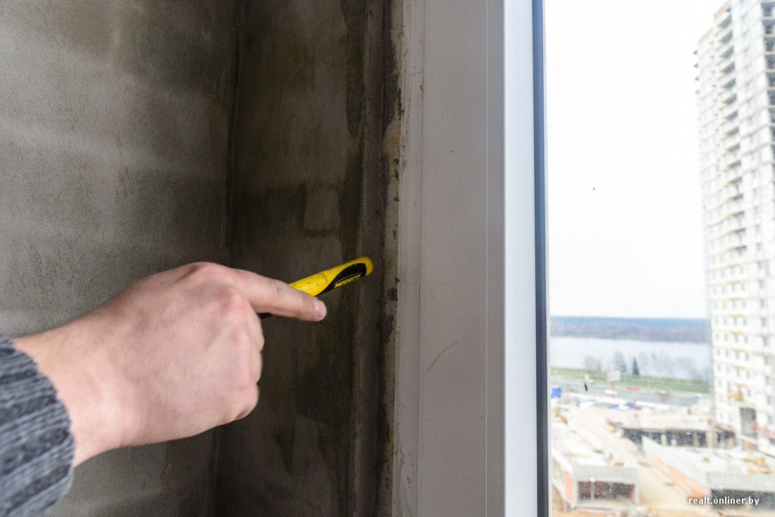 — На самом деле это не критично. Гораздо хуже то, что между рамой и стеной нет нащельника. К тому же на многих рамах отсутствуют декоративные накладки и противоконденсатные заглушки, некоторые наличники установлены не в уровень, откосы неровные, под отливами нет шумоизолирующей подложки. Имеются пропуски штукатурки — углы как будто погрызены. Будем указывать в акте абсолютно все недостатки, чтобы потом строители не сказали, что «таких указаний не было», — предупреждает Геннадий. Строитель же обещает исправить «мелочовку» сразу же, как только мы уйдем.