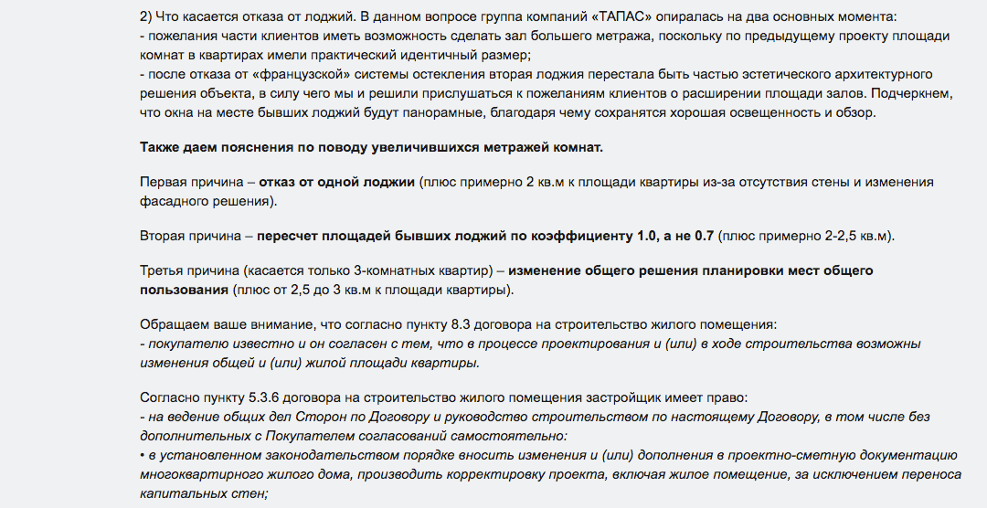 Однако такой поворот событий допускается одним небольшим пунктом составленного между сторонами договора: «5.3.6. На ведение общих дел Сторон по Договору и руководство строительством по настоящему Договору, в том числе без дополнительных с Покупателем согласований самостоятельно: в установленном законодательством порядке вносить изменения и (или) дополнения в проектно-сметную документацию многоквартирного жилого дома, производить корректировку проекта, включая жилое помещение, за исключением переноса капитальных стен». Подписали — получили. На форуме сразу же закипели страсти.