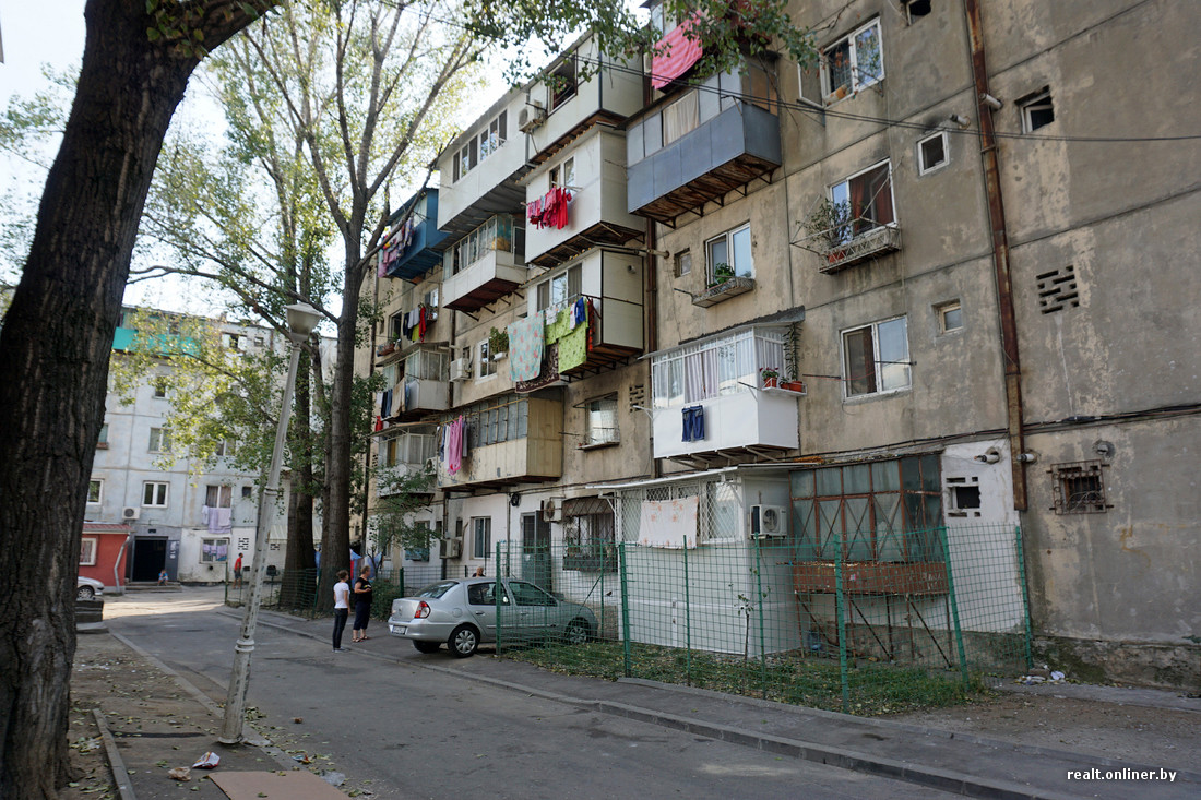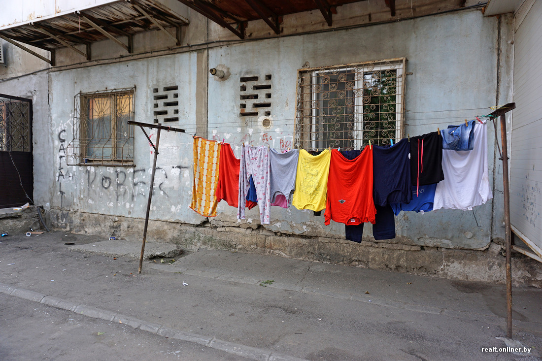 Пестро одетые дети затеяли игру со спущенным мячом. Буквально у каждого подъезда сидят по несколько человек. Где-то просто курят, где-то ведут экспрессивный разговор. Наше появление не осталось незамеченным. Стоит достать фотоаппарат и сделать несколько кадров — и в спину несется «непереводимая игра слов».