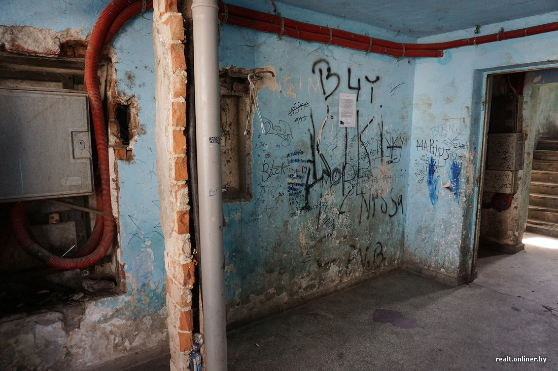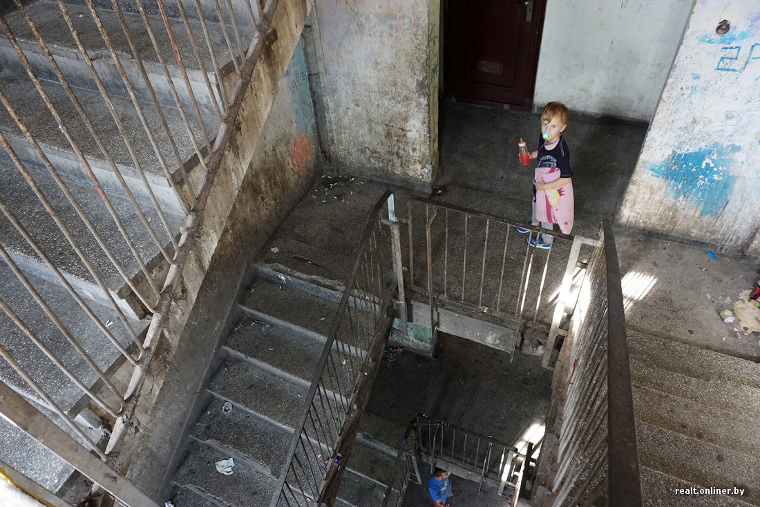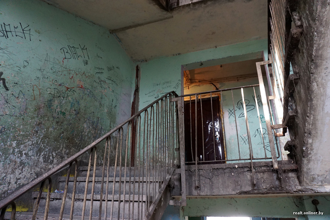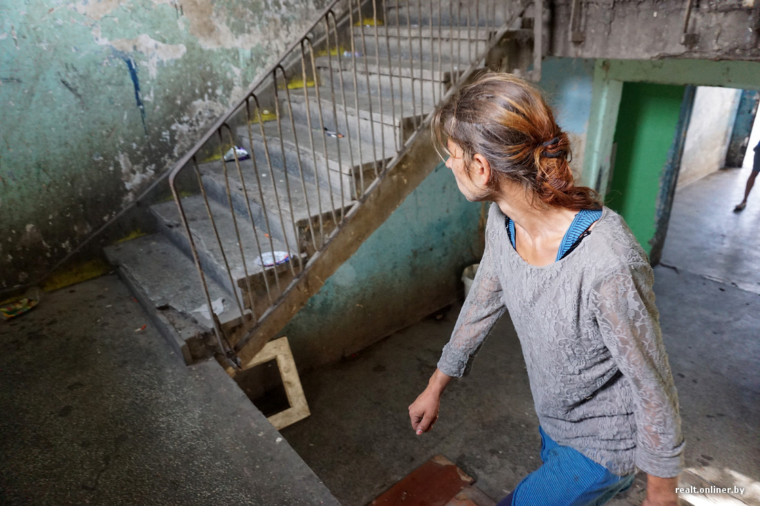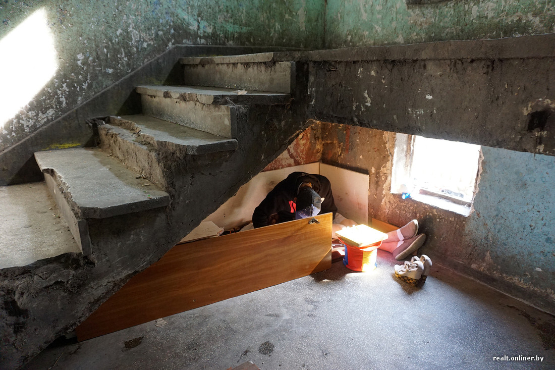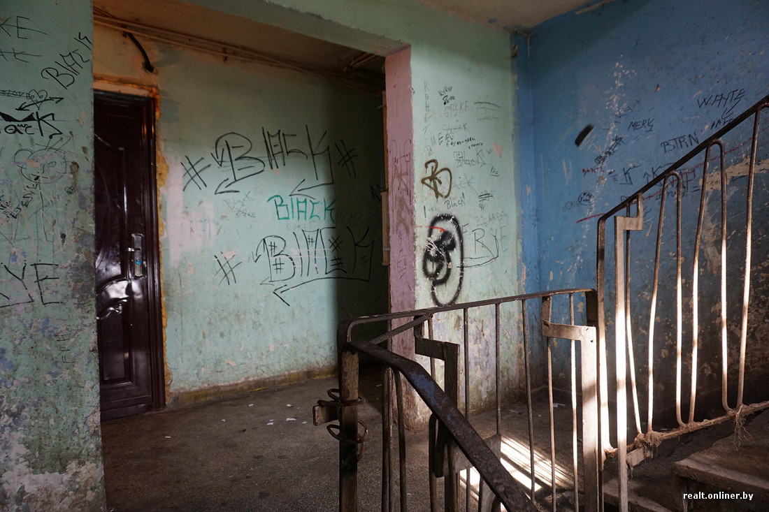 В самых запущенных домах нет подъездных дверей, на первом этаже отсутствует лестничное ограждение. Годами не мытые стены испещрены надписями, плевками и подтеками рвотных масс. Заходим внутрь и тут же замечаем наркомана — забившись под лестницу, он делает себе инъекцию куда-то в бедро.