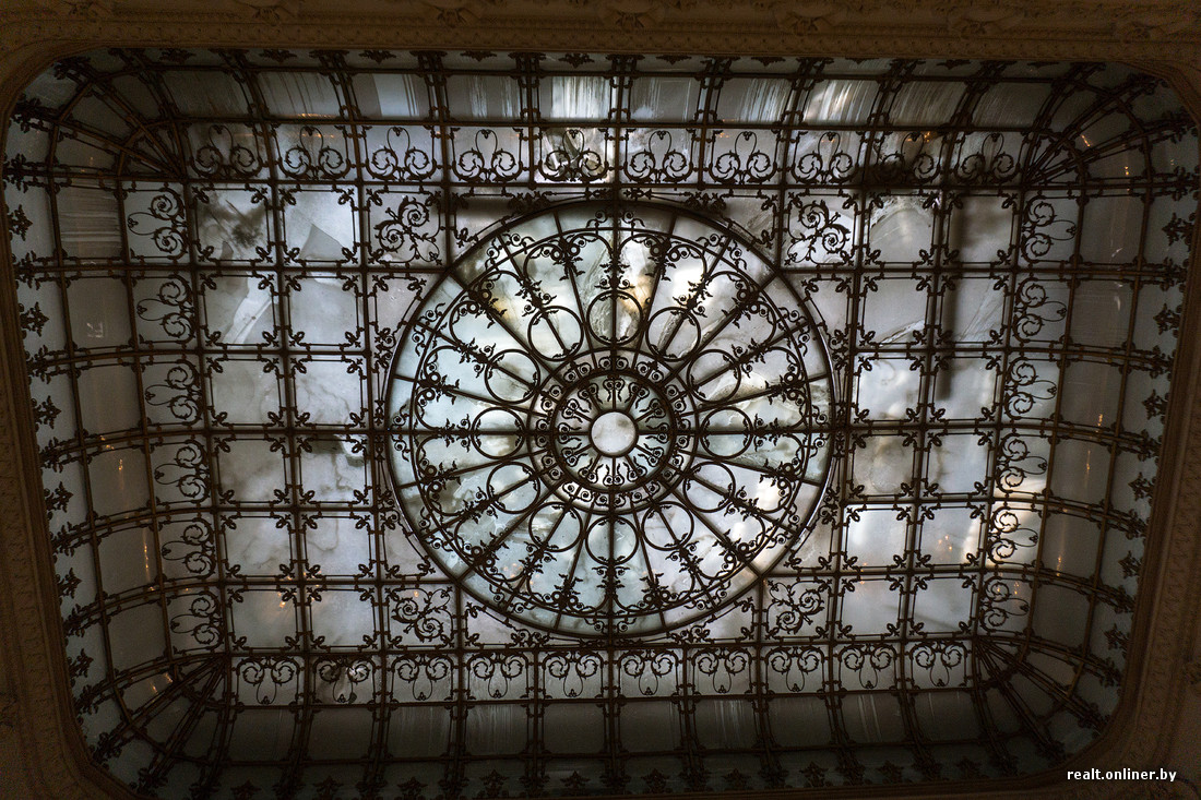 Мраморный холл этажом выше украшен потрясающей красоты стеклянным потолком.