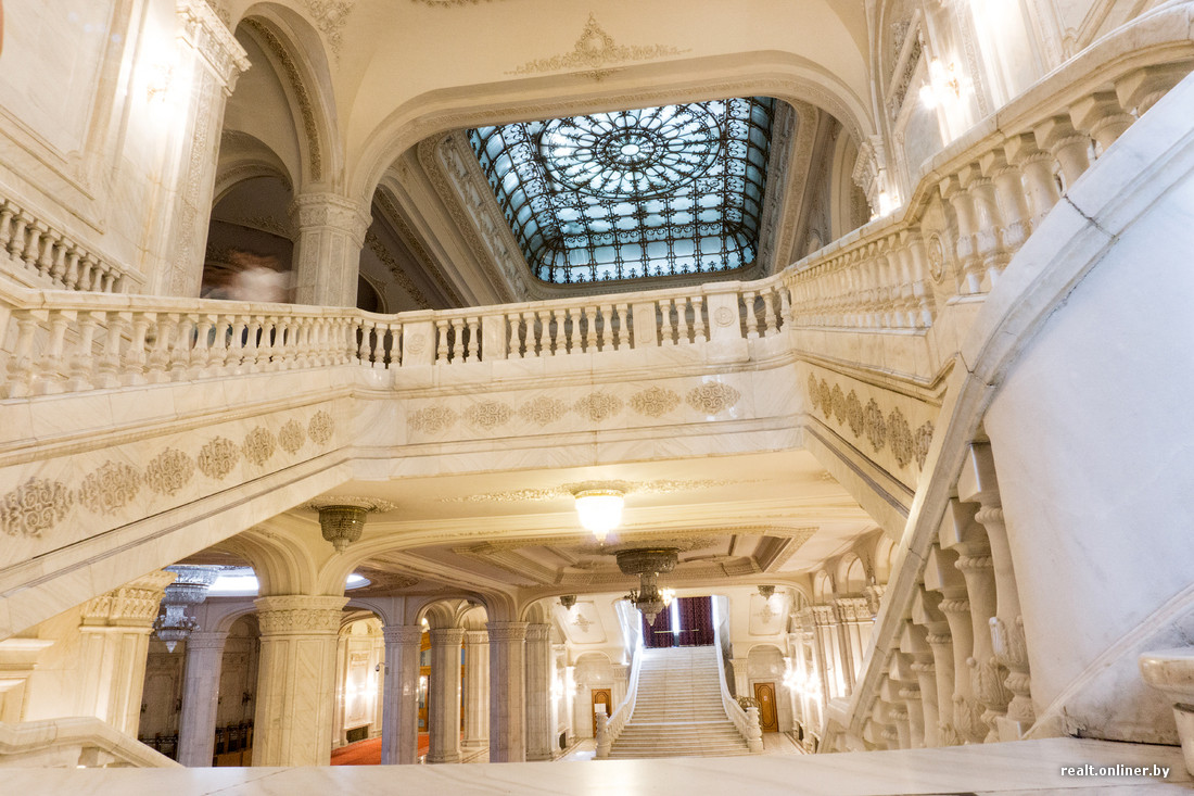 Величественный мраморный холл сообщается с верхним этажом двумя монументальными лестницами. Одна из них предназначалась для Николае Чаушеску, вторая — для Елены. Супруги должны были одновременно спускаться по ступенькам друг навстречу другу и, встретившись внизу, приветствовать прибывающих во дворец почетных гостей.