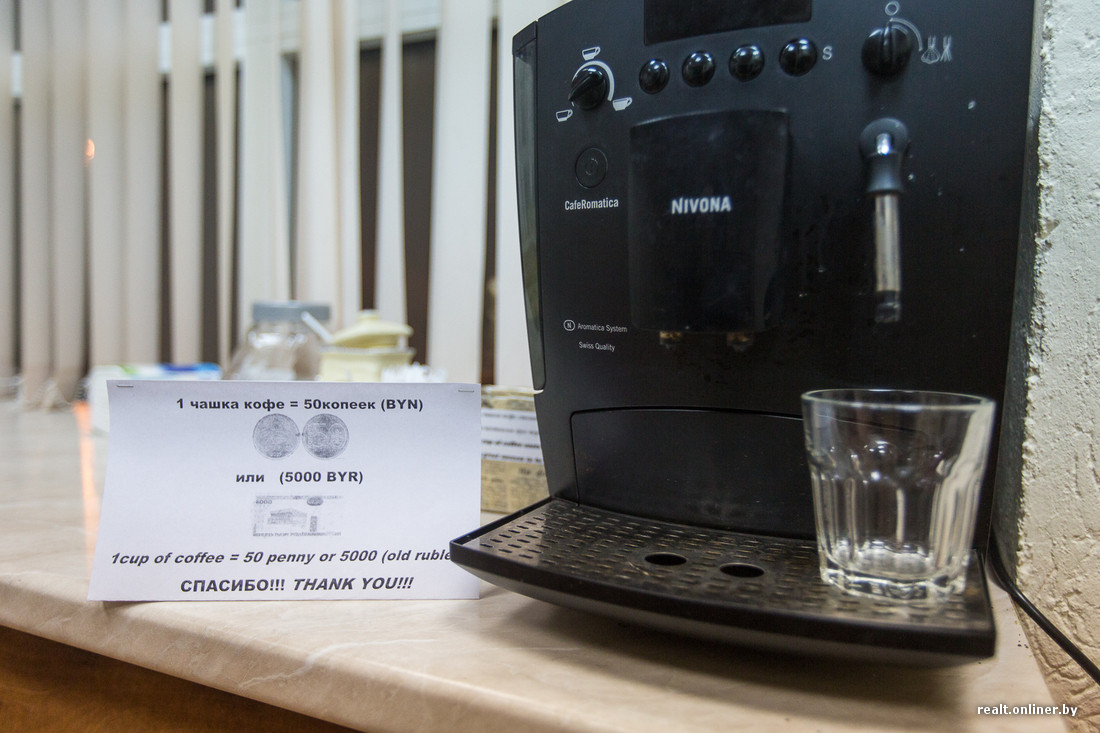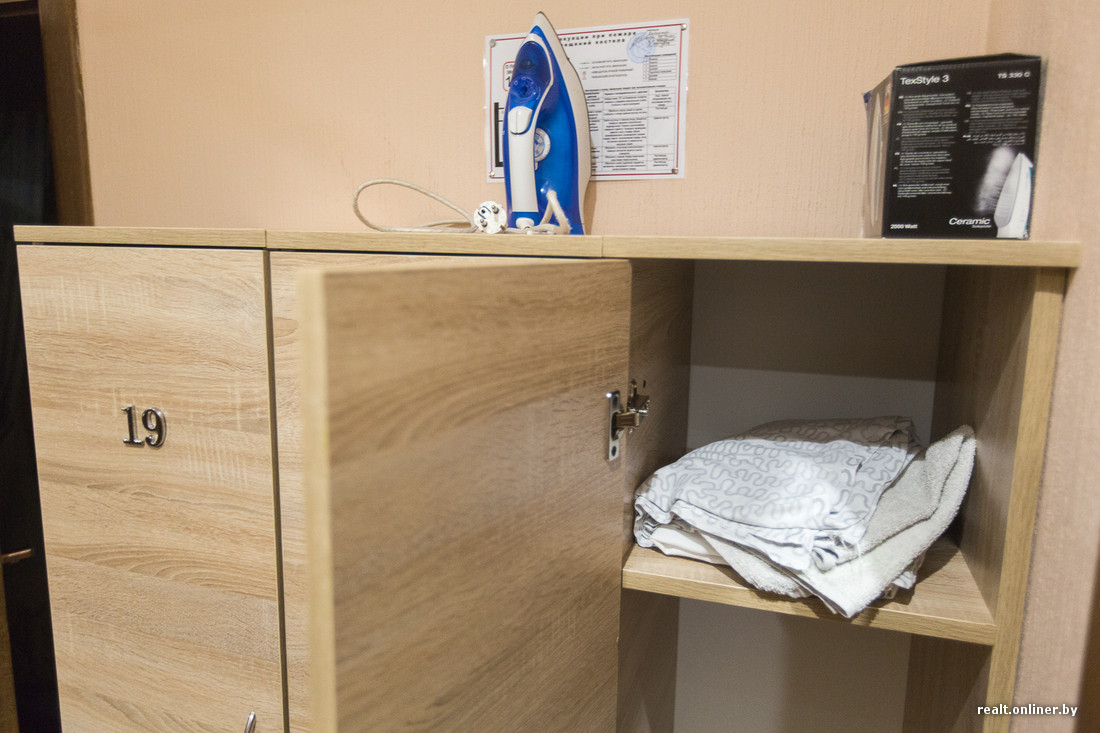 На ресепшене есть меню минских кафе, осуществляющих доставку еды. Но если у постояльца туго с деньгами, от голода он не умрет: можно бесплатно приготовить макароны и крупы.