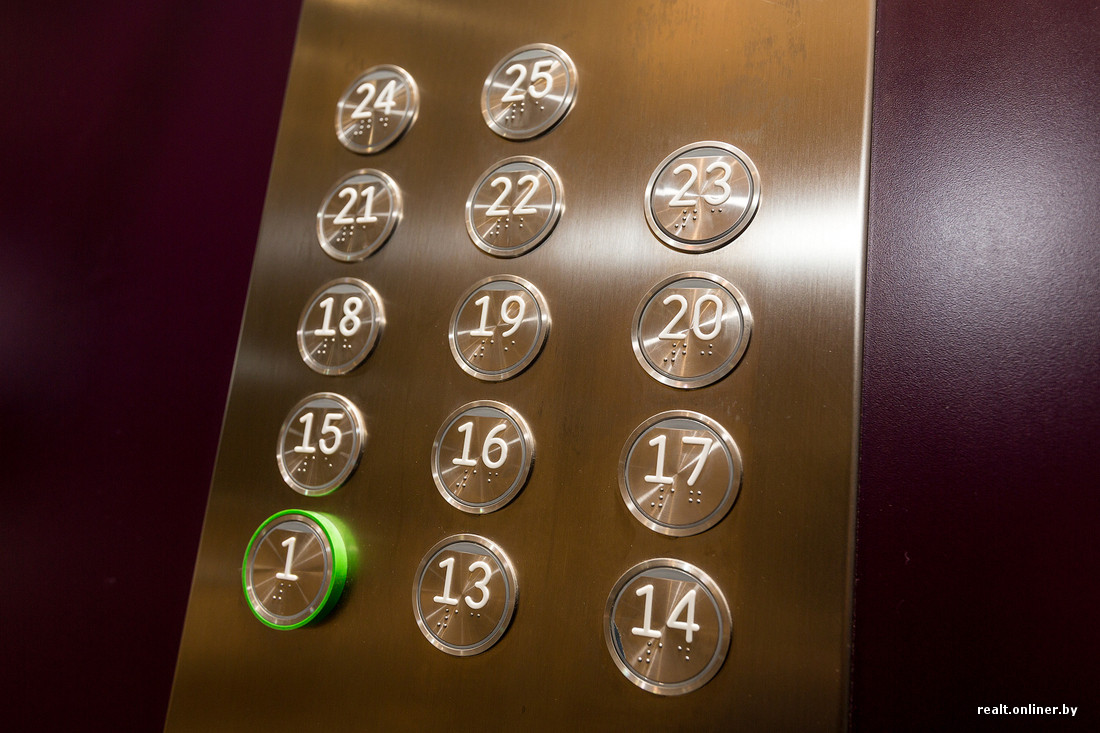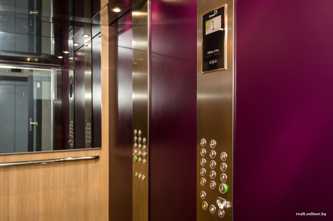 Лифты испанские Orona. В них есть две уникальные вещи, которые впервые применены в Беларуси: встроенные в зеркала мониторы, на которые может подаваться информация любого характера (в том числе рекламная) и возможность вызывать лифт со смартфона (система пока тестируется).