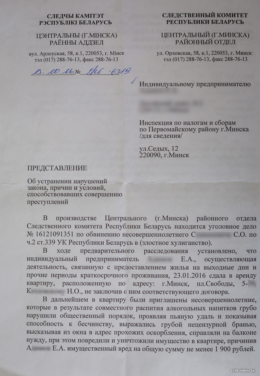 Мы предлагали хозяйке деньги за то, что он разбил, но она отказалась. Я звонила и этому совершеннолетнему парню, который снял квартиру, предлагала: скиньтесь вы деньгами и возместите женщине ущерб, вас же много было. В конце концов, у вас гражданско-правовые отношения: поотдыхали некорректно — заплатите. Зачем растягивать это на год? Уже бы давно дело было закрыто. Но никто не хочет, не реагирует. Скоро дело пойдет в суд (хоть я и подала ходатайство о прекращении), начнутся слушания — приходите и наблюдайте за ходом процесса.