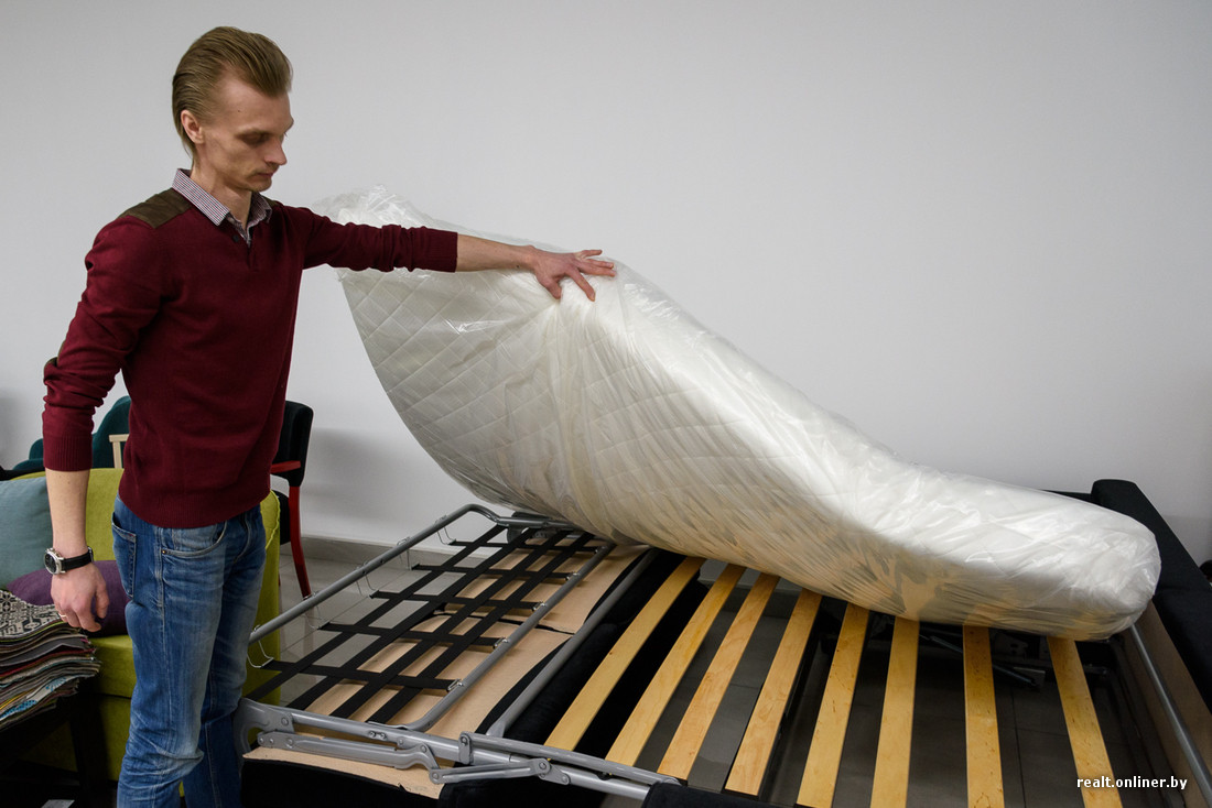 — Богатая цветовая гамма, современный дизайн, каркас из массива бука, — говорит консультант. — Обратите внимание на компактные диваны, идеально подходящие для небольших квартир: механизм «итальянская раскладушка», латексный или пенополиуретановый матрас, ортопедическое основание. Единственный недостаток — нет отделения для хранения постельного белья.