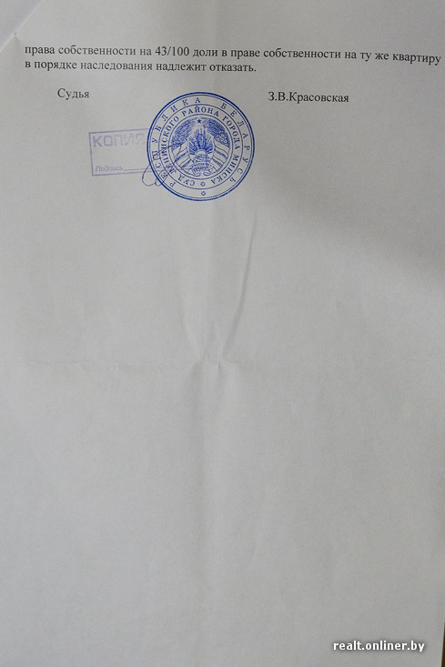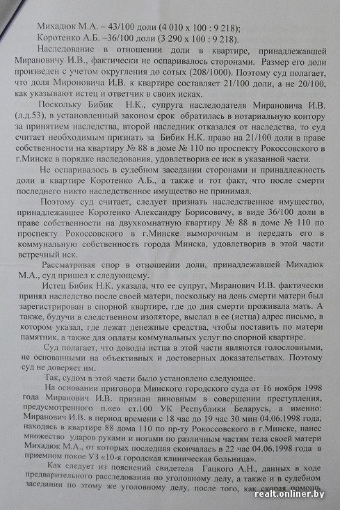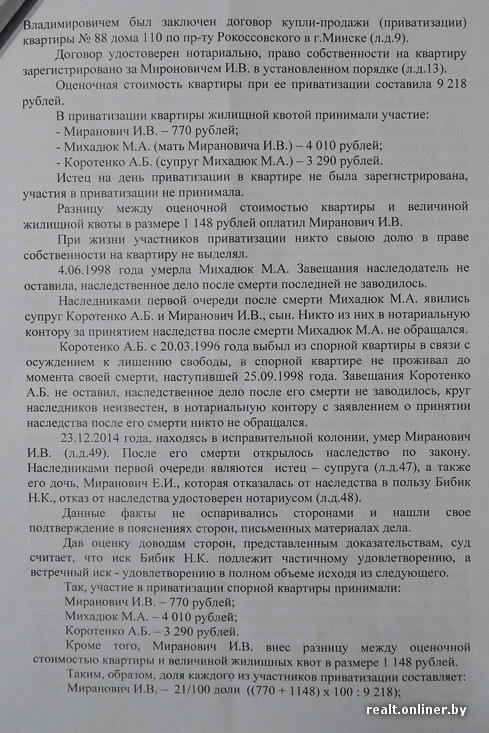 — Суд закончился тем, что за мной признали 21/100 долю квартиры, остальное — выморочное с передачей в коммунальную собственность. Представьте, в 41-метровой квартире прямым наследникам оказалось положено только 8 квадратных метров общей площади, или 5 жилой. А на остальные метры, как мне сказали, могут подселить неплательщиков — тех, кто годами не платит по «жировкам» в своих квартирах и, понятное дело, не будет платить и здесь. Короче, перспектива соседствовать с алкашами. Насколько я знаю, не учли и тот факт, что разница между квотами и рыночной стоимостью квартиры была оплачена из семейного бюджета, ведь мы были женаты, а значит, в этой квартире есть и моя доля. То есть если вы делите на доли, то делите на всех. Но как-то не вышло, — замечает минчанка.