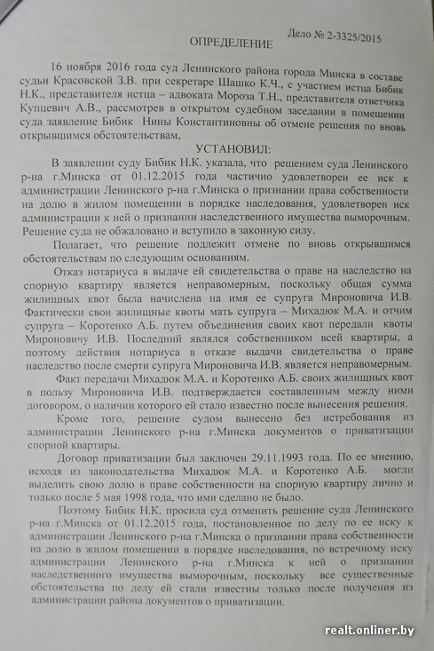 В 2015 году Нине пришлось побывать в суде уже по квартирному вопросу: женщина пыталась доказать, что как минимум доли умерших родителей собственника должны достаться наследникам (дочке и внучке). Исполком Ленинского района оперативно подал встречный иск о признании долей Михадюк и Коротенко выморочными и передаче их в коммунальную собственность.