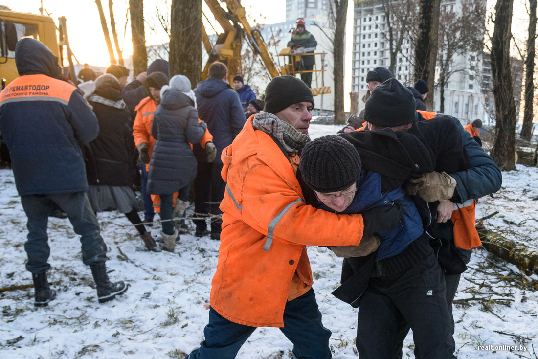 Около четырех часов дня ситуация стала выходить из-под контроля, стороны до того разошлись, что перебранка переросла в потасовку. Крепкие мужчины в дорожной форме (а отнюдь не милиция) начали оттеснять активистов, те возмутились, дальше в ход пошли более активные действия. Фотокорреспондент Onliner.by побывал на месте события. Вы можете сами оценить накал страстей.