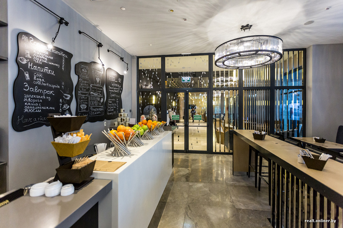 — В кафе осуществлена концепция pret a manger — все блюда готовы, их не нужно долго ждать, но в то же время это не фастфуд, — рассказала Onliner.by представитель отеля. — Предлагается здоровое питание: хорошие сэндвичи, супы, свежие салаты и свежая выпечка, которая изготавливается прямо здесь. Все это можно взять с собой. Здесь же можно купить большое фирменное печенье Double Tree by Hilton в металлических банках, стоимость 6 печений — 23 рубля. Такая баночка прекрасно подойдет в качестве подарка. Кроме закусок, в кафе зимой предлагаются глинтвейны, летом — освежающие коктейли, круглый год — вина и пиво.