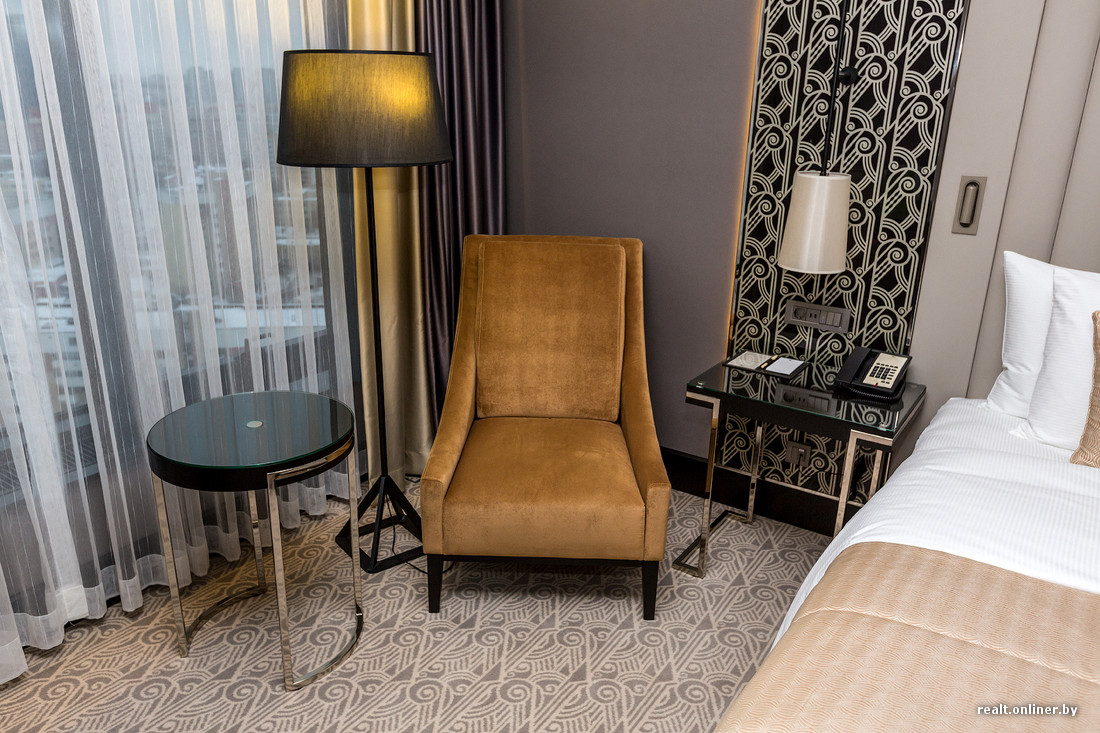 Отправляемся изучать номера. Зона лифтов, собственно как и многие элементы в гостинице, выполнена в стиле ар-деко, отсылающем к 20-м годам прошлого столетия. Сразу вспоминаются нью-йоркские гостиницы из старых фильмов. Лифты же установлены без признаков ретро: скоростные фирмы Kone, выполненные в глянцевом черном цвете. Первые 6 этажей занимает торгово-развлекательный центр Galleria Minsk, поэтому сама гостиница начинается с 7-го этажа.