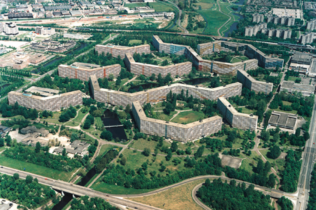 Согласно этой концепции на большом участке свободно расставлялись прихотливо изломанные протяженные жилые дома, напоминающие своей конфигурацией пчелиные соты. Между зданиями создавались хорошо озелененные рекреационные зоны с большими водными пространствами, а все автомобильное движение осуществлялось по поднятым на второй уровень эстакадам. Выбранный многоэтажный формат домов, возводимых индустриальным способом (фактически те же самые привычные и нам «панельки»), позволял существенно снизить издержки на строительство и, следовательно, арендную плату за квартиры.