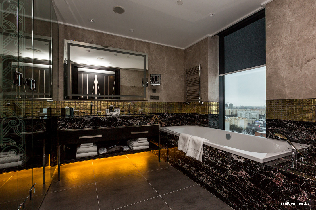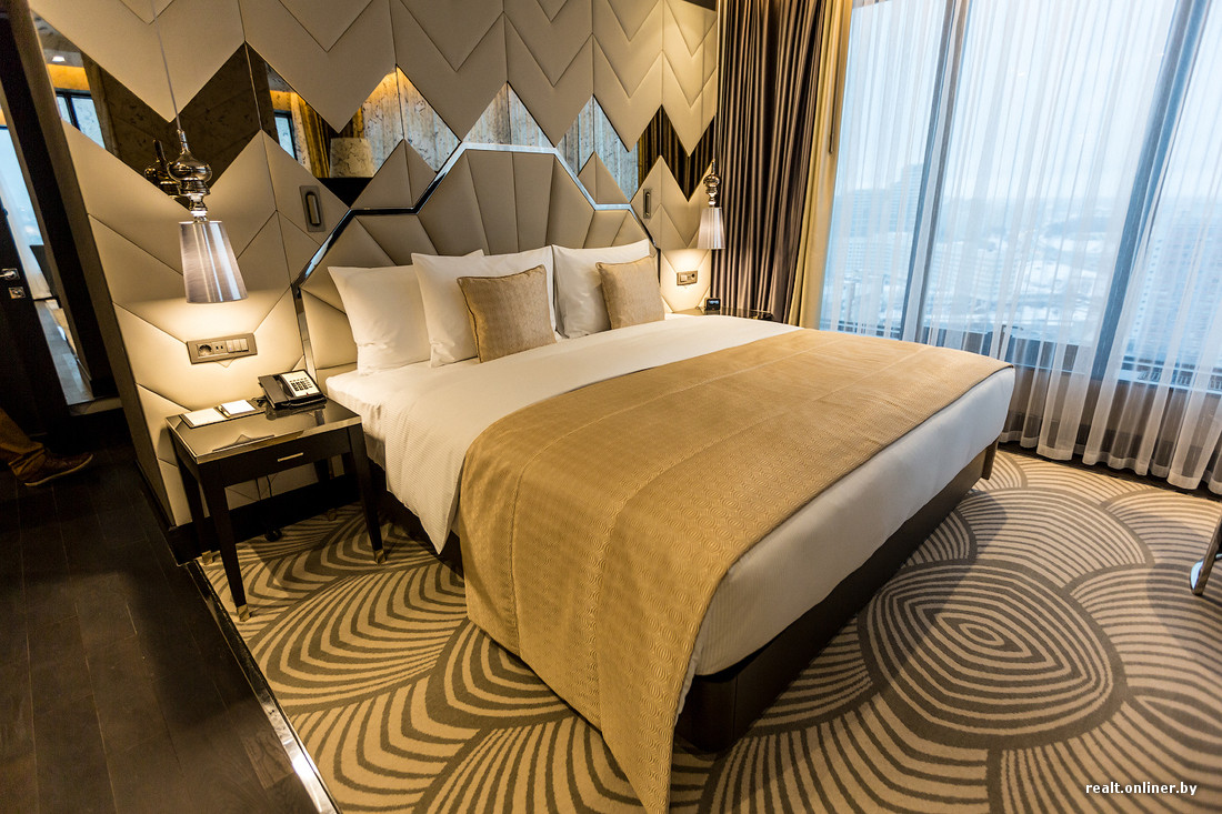 Директор по дизайну интерьеров студии Alexander James Ричард Мортон и дизайнер Сара Брукер встречают нас в отеле, который оформлен по их проекту. Улыбчивые англичане утверждают, что дизайн помещений был воплощен без единого отступления от созданных рендеров. Для этого пришлось изрядно потрудиться над поиском материалов, которые прибывали в Минск со всего мира.