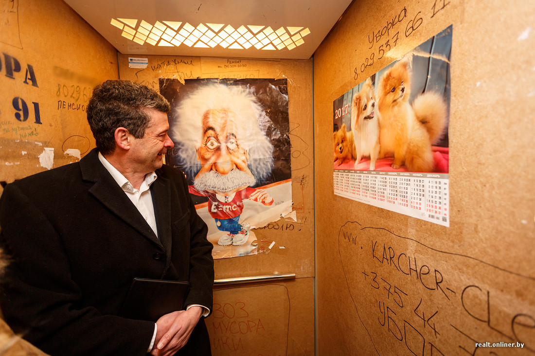 А вот один из подъездов вызвал у наших спутников грусть. Им даже было некомфортно ждать лифт в узком помещении, выкрашенном в унылый голубой цвет.