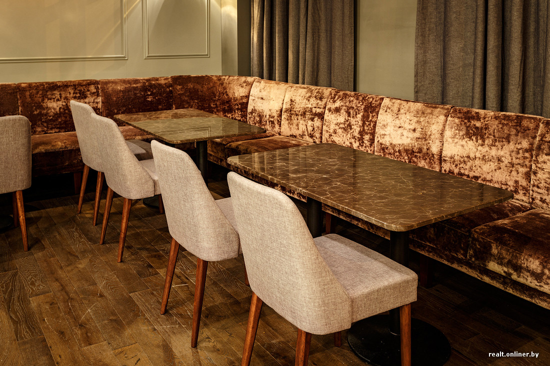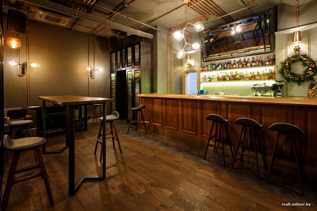 — Это коктейльный бар, выдержанный в стилистике 70-х годов Лондона, с элементами легкой эклектики, — рассказал Onliner.by соучредитель бара. — Немного заморочились с проводкой и сделали ее медной. Среди признаков 70-х — стеновые панели, классическая деревянная барная стойка с элементами латуни, натуральные материалы, много дерева.