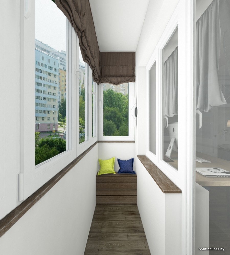 Балкон решено сделать местом отдыха. Так как дом находится в старом районе, в теплое время года двор цветет и пахнет, из окон видно множество зеленых деревьев. Поэтому на балконе будет приятно проводить время и лицезреть природу.