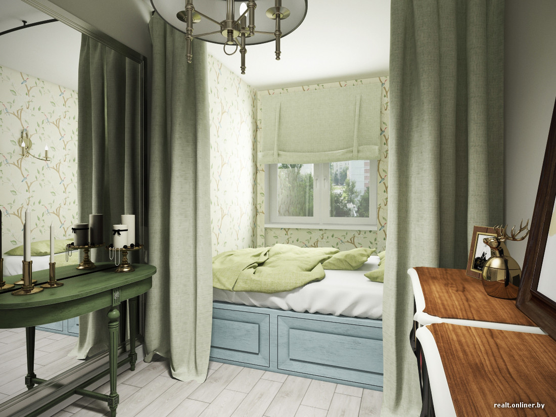 К спальне у молодых людей требования минимальные: главное, чтобы был туалетный столик и большая кровать. Яна же, как истинная девушка, выразила желание сделать спальню в романтическом стиле с использованием элементов шинуазри и отталкиваться от нежно-зеленых, бежевых оттенков. Есть у Яны и странная фантазия — отгородить кровать от общего пространства прозрачной шторкой.