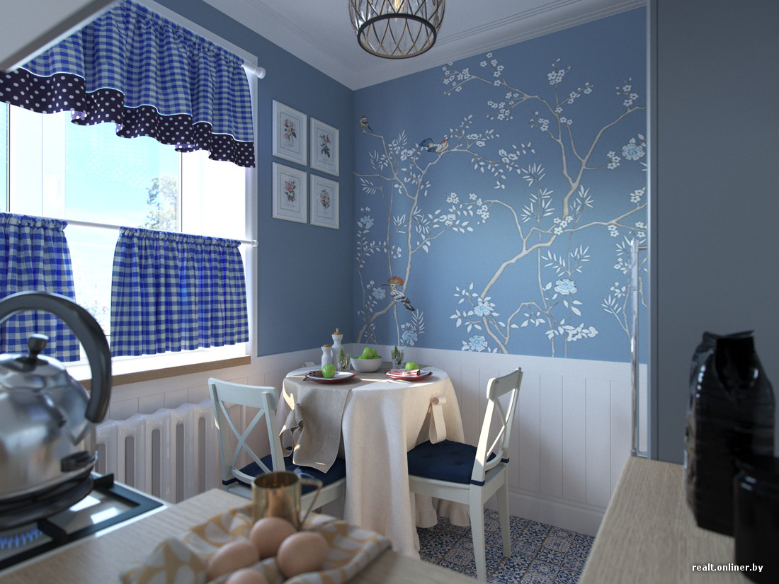 Кухня в квартире по-хрущевски маленькая, поэтому пара попросила дизайнеров придать ей максимальную функциональность: спрятать батарею, предусмотреть выдвижные рабочие поверхности, использовать потенциал подоконника, использовать стол и стулья небольших размеров и каким-нибудь образом вместить технику — посудомоечную машину, микроволновую печь и электрический духовой шкаф. Кухню Яна предложила сделать в стиле прованс с преобладающими голубым и бежевым цветами.