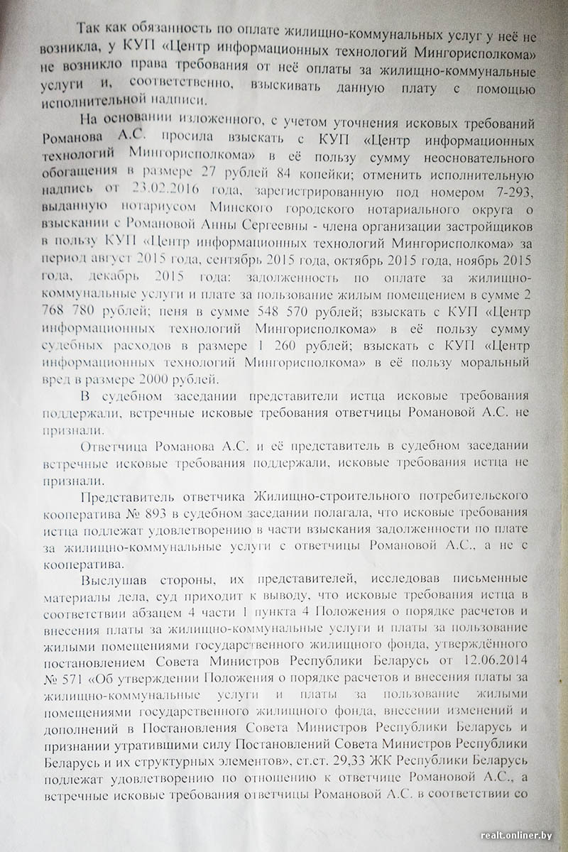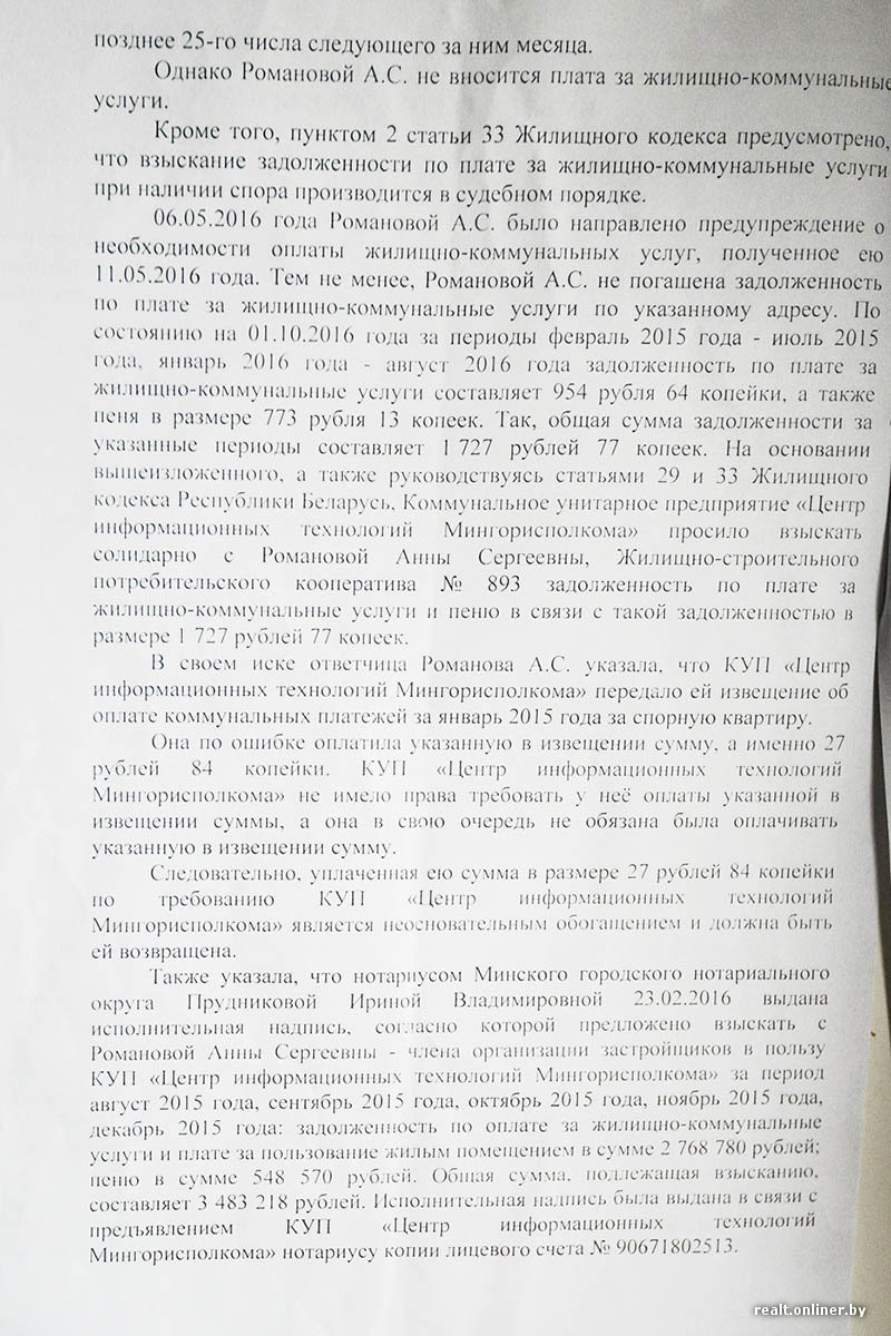 И без того больной квартирный вопрос Анны осложнился судебной тяжбой: в 2016 году Центр информационных технологий Мингорисполкома подал иск против минчанки из-за того, что она годами (сколько идет разбирательство по квартире) не оплачивала коммунальные услуги.