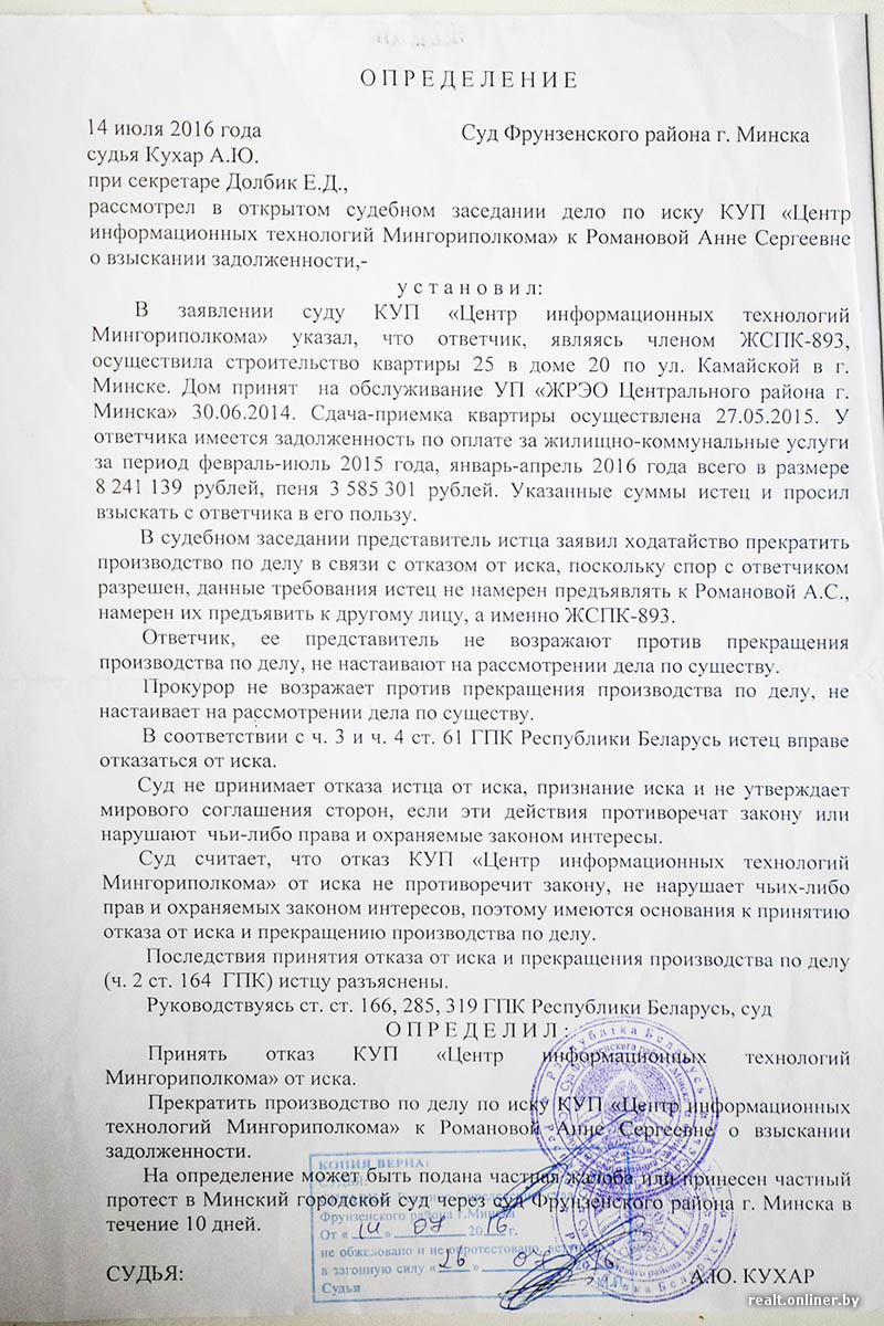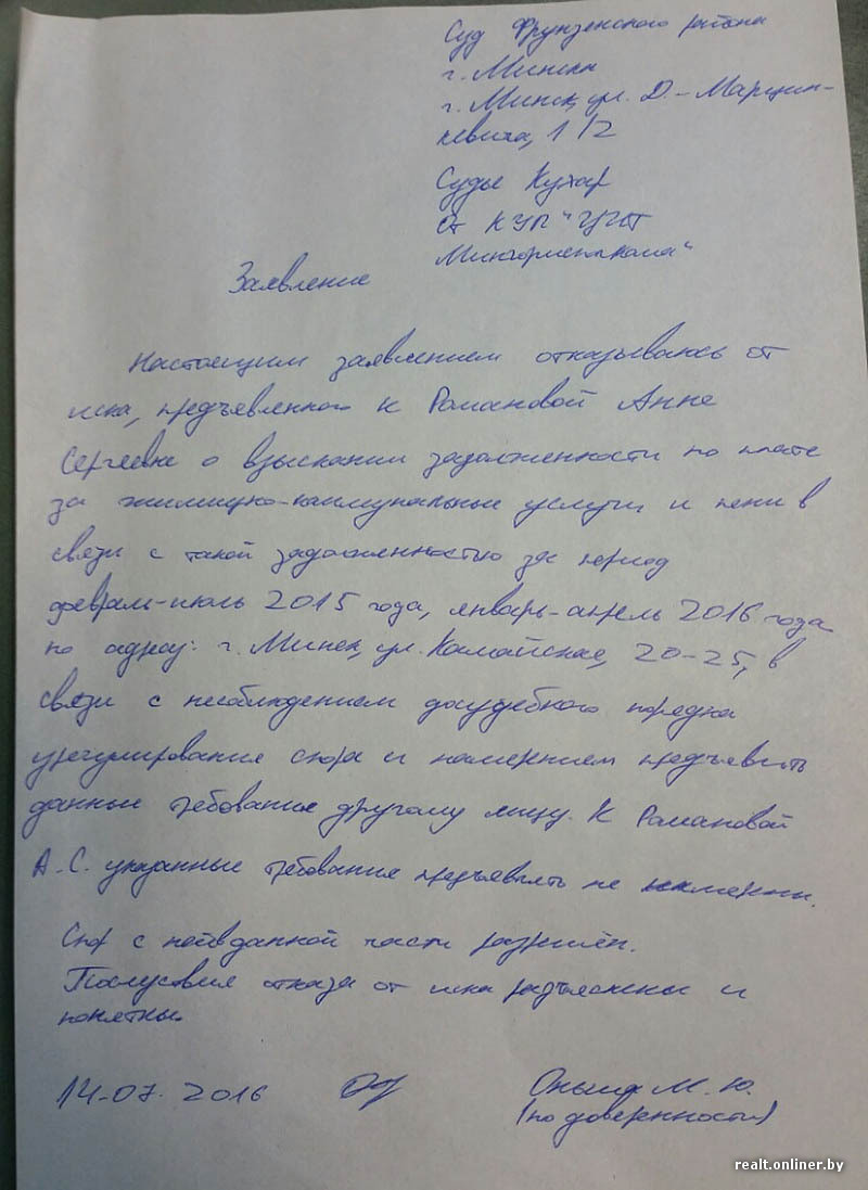 Правда, и это еще не все: Центр информационных технологий Мингорисполкома уже подавал в суд на Анну по «коммунально-денежному» вопросу, но в июле этого года юрист организации написал судье заявление, в котором отказался от претензий к минчанке «в связи с несоблюдением досудебного порядка урегулирования спора и намерением предъявить данные требования другому лицу».