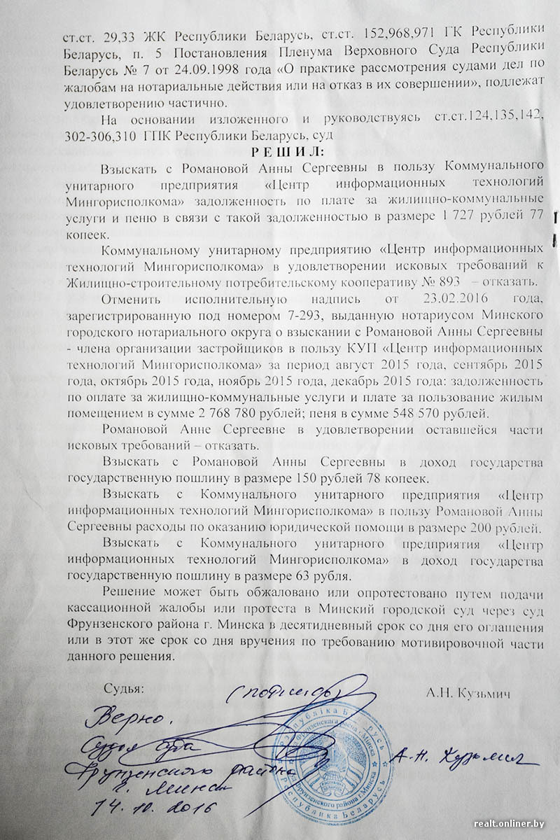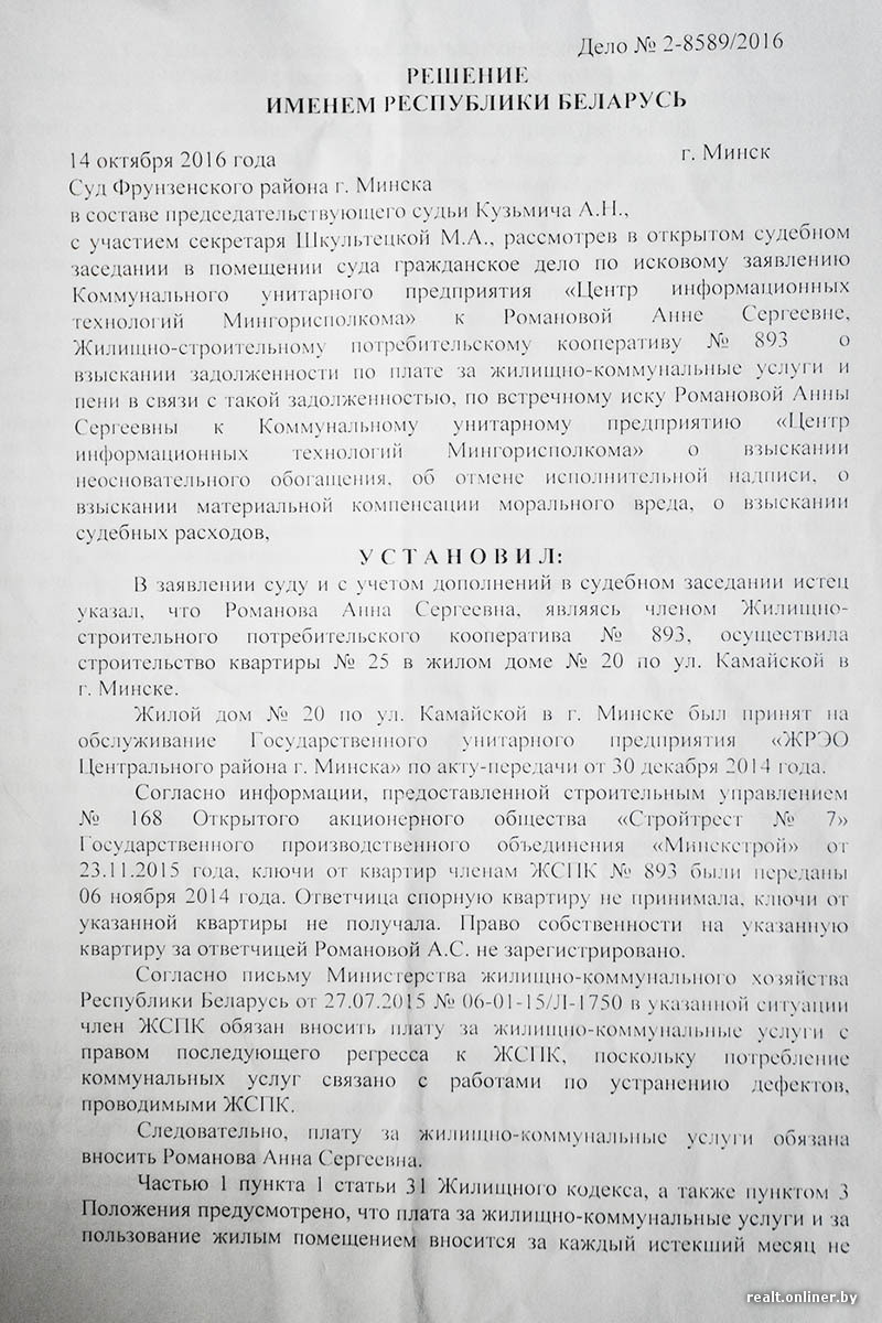 Однако через некоторое время дело удивительным образом «ожило». И 14 октября 2016 года суд решил, что Анна Романова должна оплатить всю набежавшую сумму «коммуналки» — 1727 рублей 77 копеек. Для женщины это стало шоком. На прошлой неделе вынесенное в октябре решение минчанка попыталась оспорить, но все осталось без изменения.