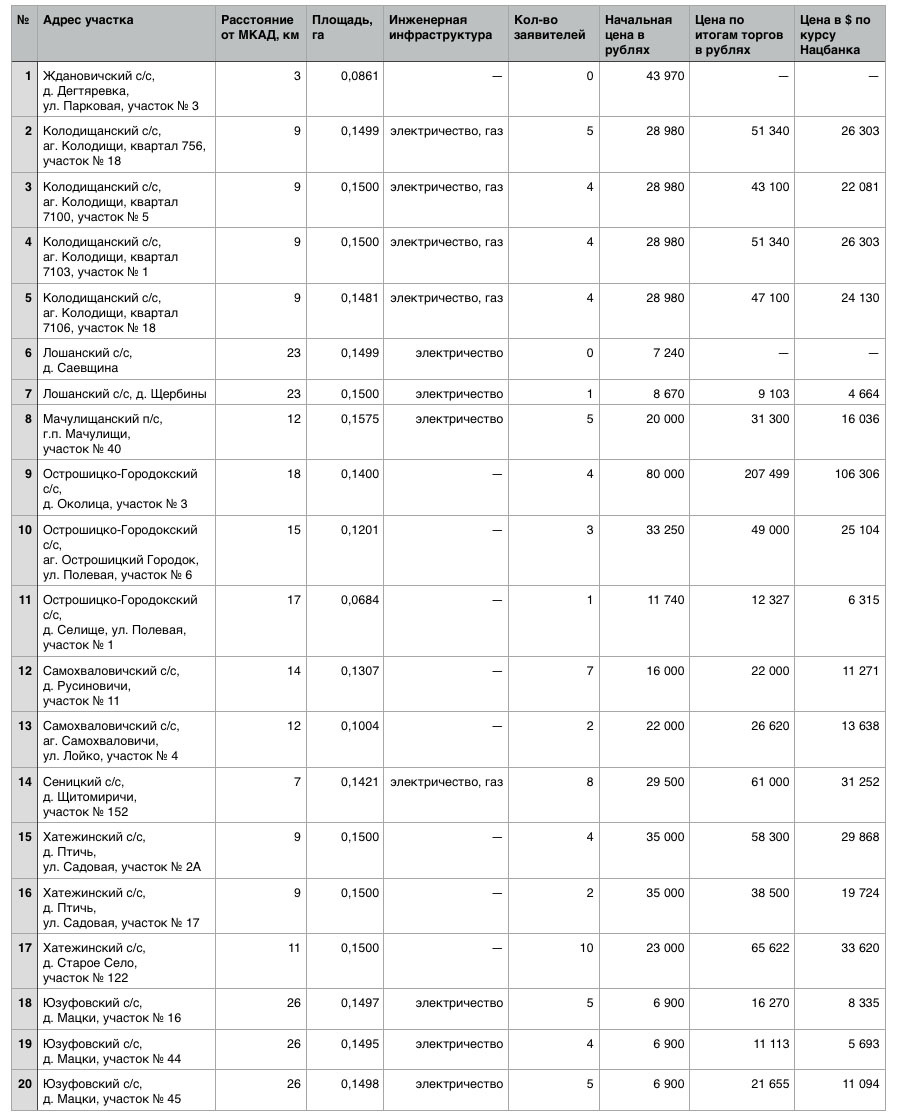 7 человек пожелали приобрести участок площадью 13 соток без коммуникаций в деревне Русиновичи, что в 14 км от МКАД. Стоимость лота увеличилась с 16 000 до 22 000 рублей ($11 271). Интерес 8 заявителей вызвал участок площадью 14 соток с электричеством и газом в Щитомиричах (7 км от МКАД). Этот надел подорожал более чем в два раза — до 61 000 рублей ($31 252). Наибольшим же спросом сегодня пользовался участок без коммуникаций в Старом Селе (11 км от города), на который претендовали 10 человек. Стоимость 15 соток увеличилась в три раза, до 65 622 рублей ($33 620).