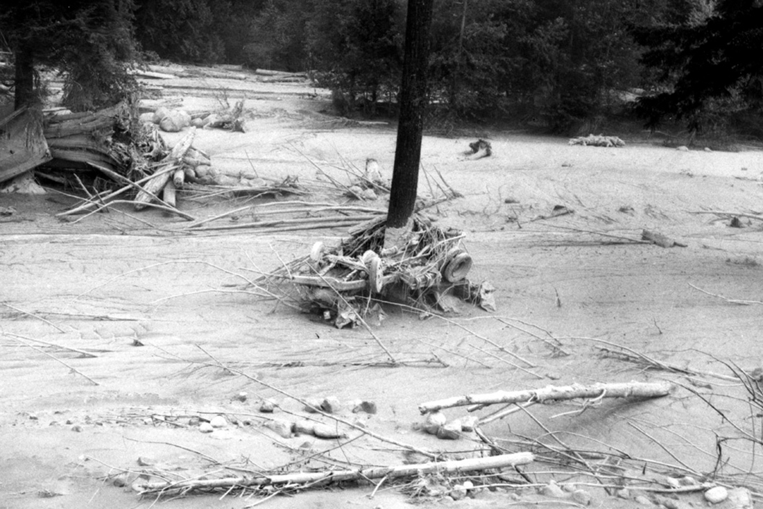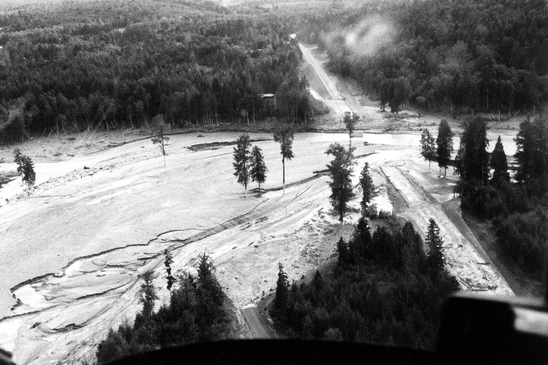 Это было боковое извержение. Вулканический купол находился на северном склоне Сент-Хеленса, и взрыв получился направленным. Верхушка «американской Фудзиямы» исчезла, на ее месте образовался уродливый кратер. Из него вниз по остаткам горы со скоростью, достигавшей несколько сот километров в час, понеслись пирокластические потоки — раскаленная смесь из пепла, вулканических газов и камней. Снег и ледники, еще сохранявшиеся на вулкане, растаяли. Вода смешалась с пеплом и горной породой, образовав т. н. лахар — своеобразную разновидность селя. Лахары последовали за пирокластическим потоком.