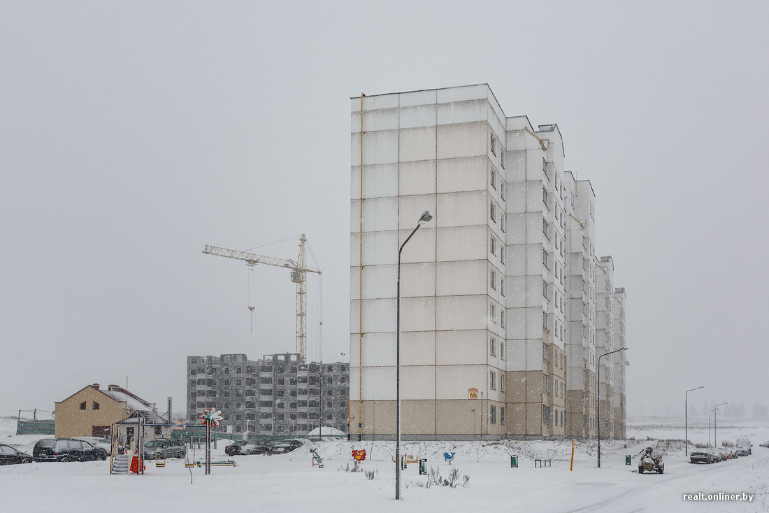 Если раньше первый минский дом одиноко стоял в чистом поле, открытый всем ветрам, то теперь у него появились соседи. Одна многоэтажка уже готова, другая в процессе строительства — это дома для жителей Смолевичей. Обещанной социальной инфраструктуры в виде школы и других объектов пока нет.