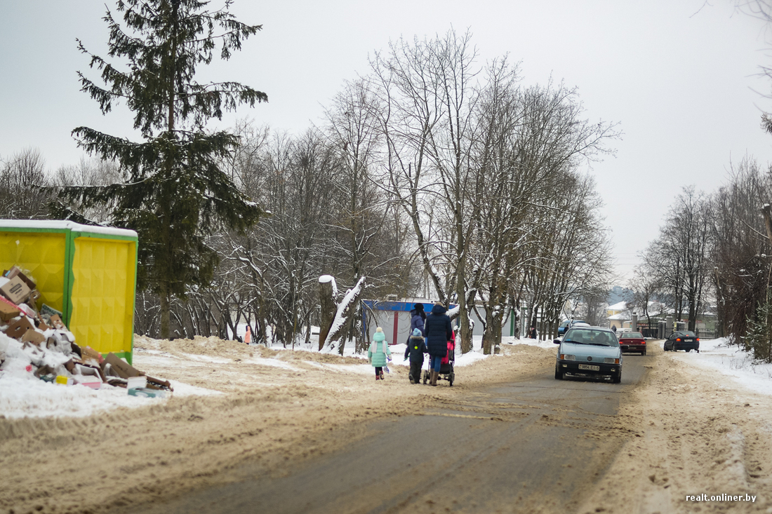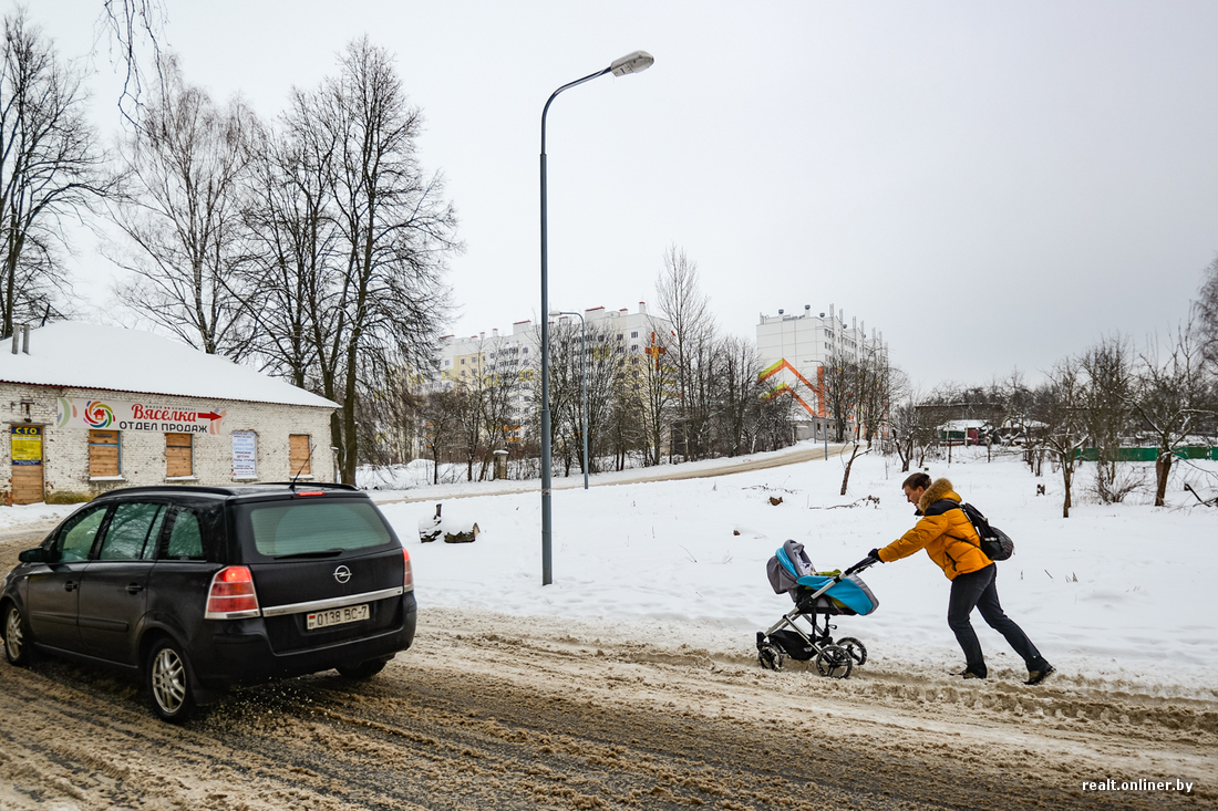Дмитрий просит нас обязательно поднять в статье проблемы агрогородка. Важнейшая из них — дороги. За пределами квартала аккуратная плиточка заканчивается. Дальше — разбитая дорога без тротуара, по которой жильцы, в том числе дети, каждый день ходят на автобусную остановку и обратно — 400 метров по снежной каше зимой. Весной и осенью там грязь, летом — пыль. Дорога, ведущая к остановке, — единственная транспортная артерия для нового района. Вся строительная техника ездит по ней же. Где мамы с колясками — там и груженые самосвалы, панелевозы, бетономешалки. Вечером вдоль дороги не горят фонари, люди светят под ноги мобильниками.
