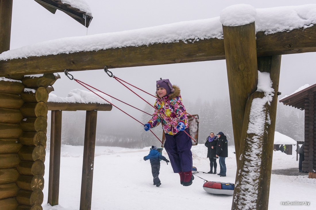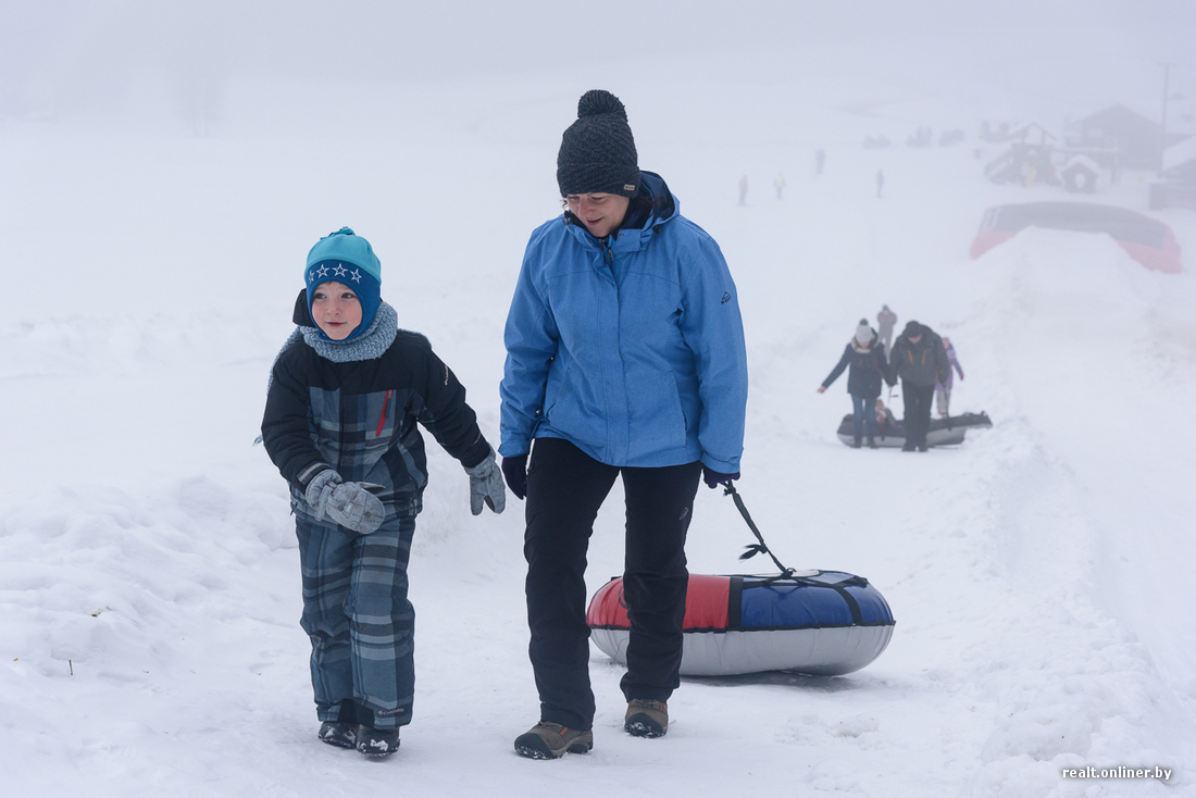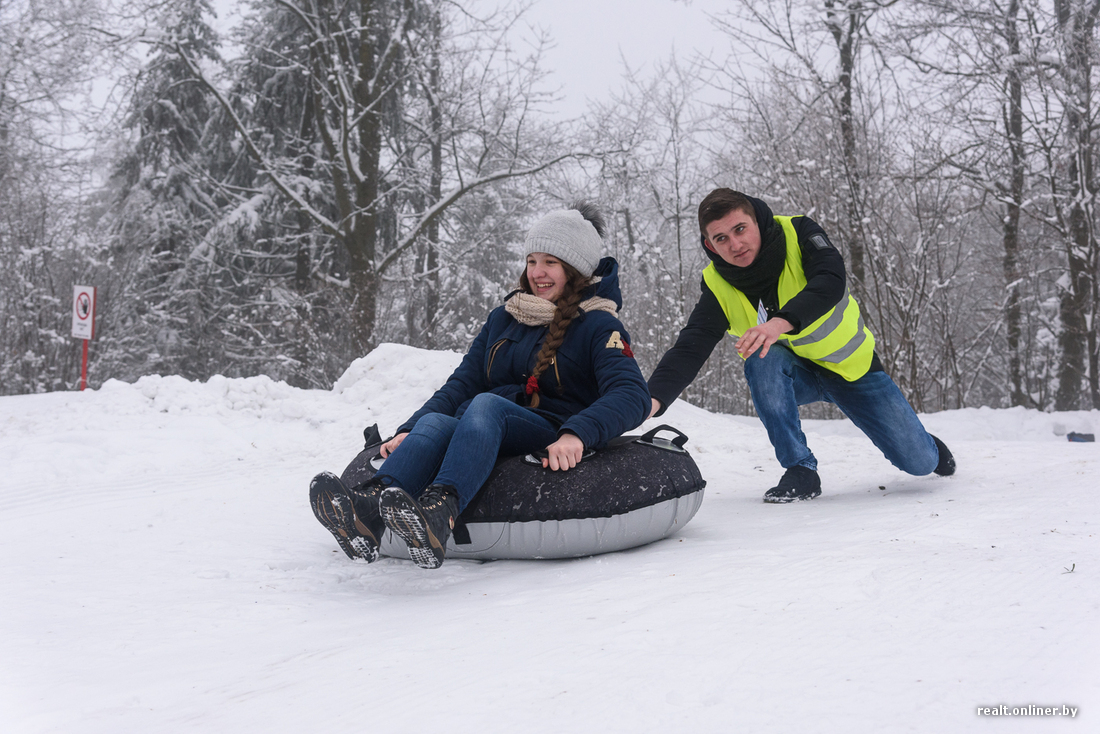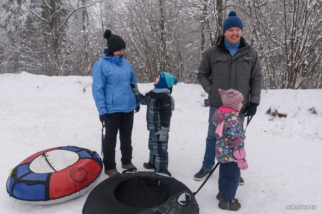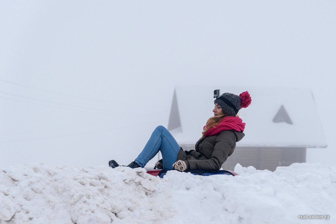 Ребята предлагают сразу попробовать. Берем парочку тюбингов и поднимаемся на горку. Подъемника здесь пока нет и этой зимой вряд ли появится: вынужденно приходится погреться.