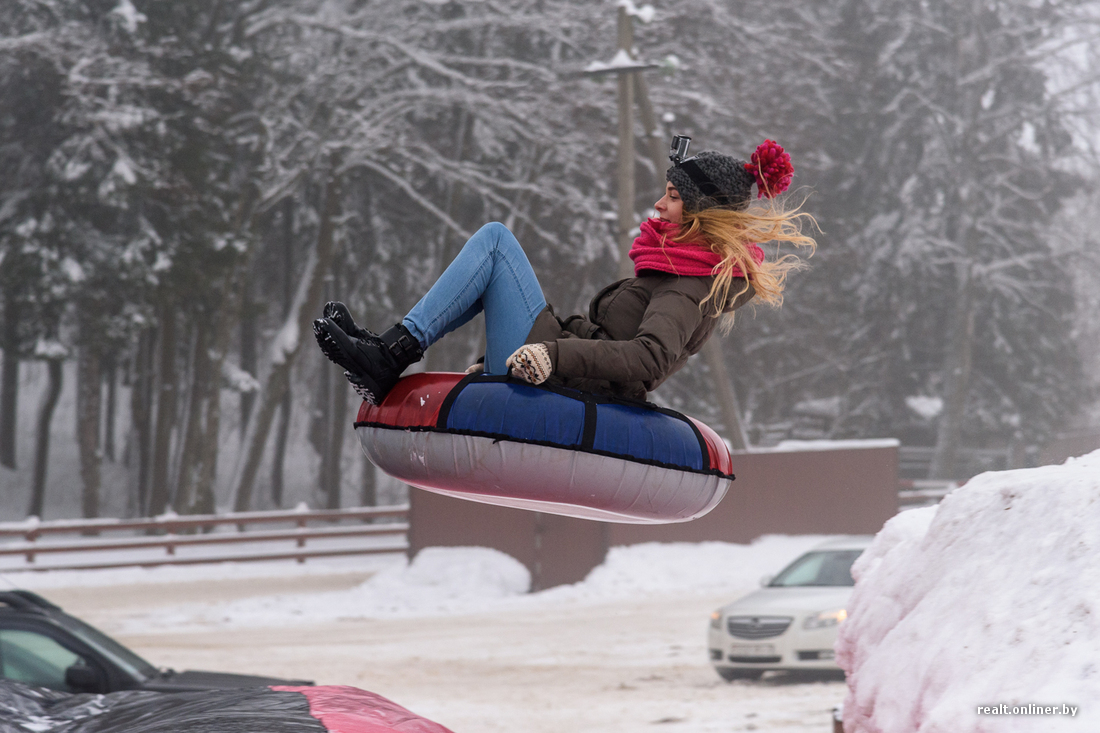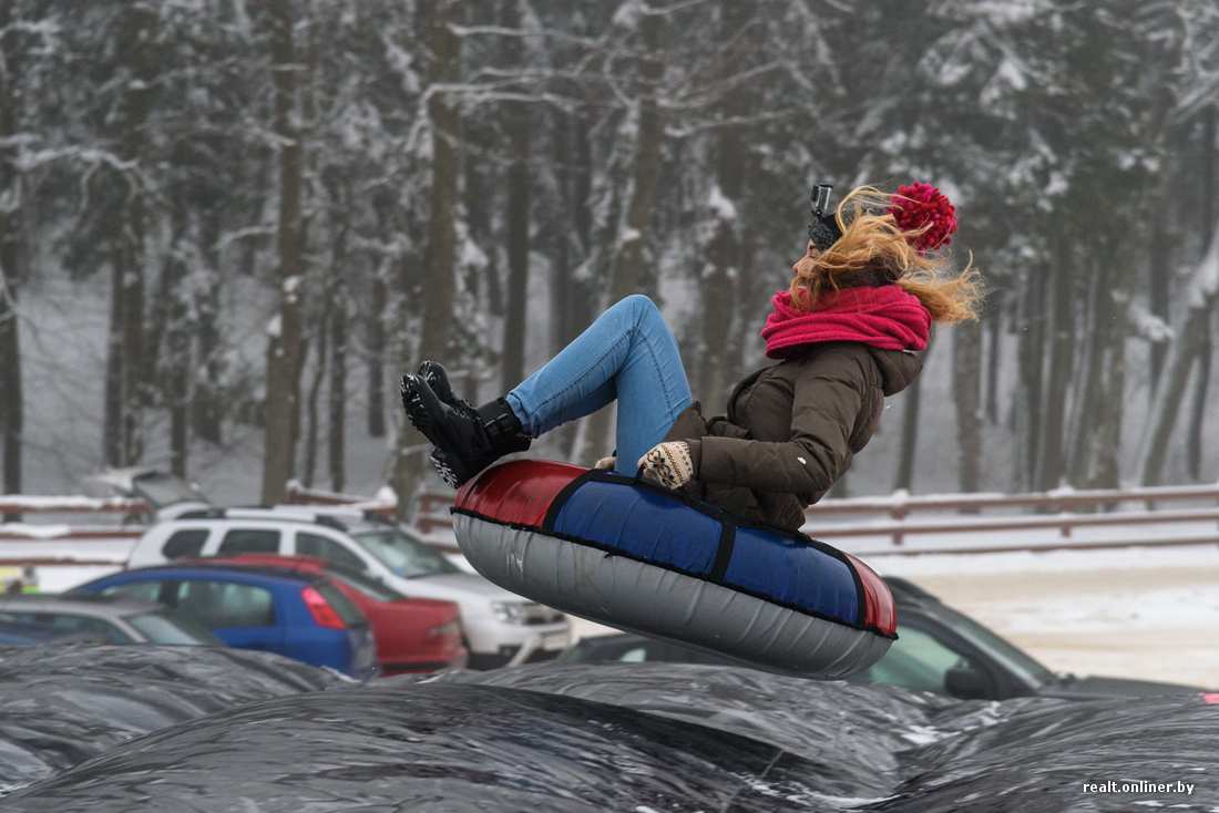 Новый аттракцион открылся здесь на прошлых выходных. Организаторы привезли пару кубометров снега, заказали незамысловатое оборудование для тюбинга, купили огромную надувную подушку, наняли инструкторов и запустили первых гостей.