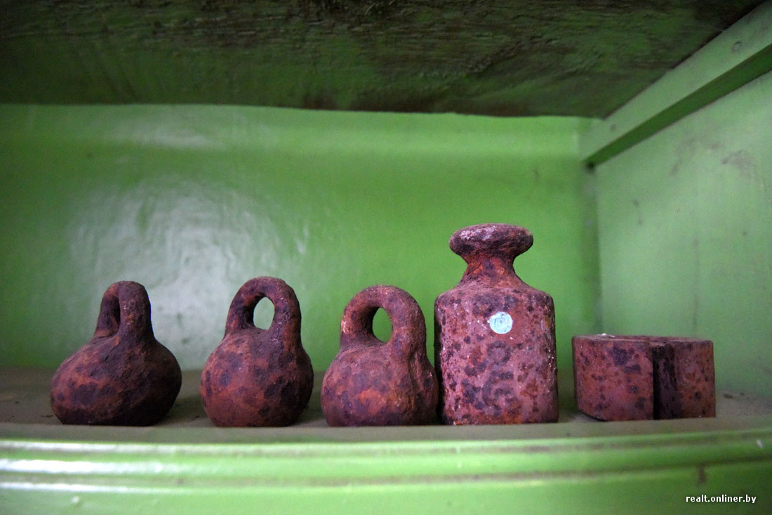 На стене — жестяная икона, на полках — ископаемые магазинные гири, в углу — рабочая соломорезка 1902 года. Все необходимое для жизни.
