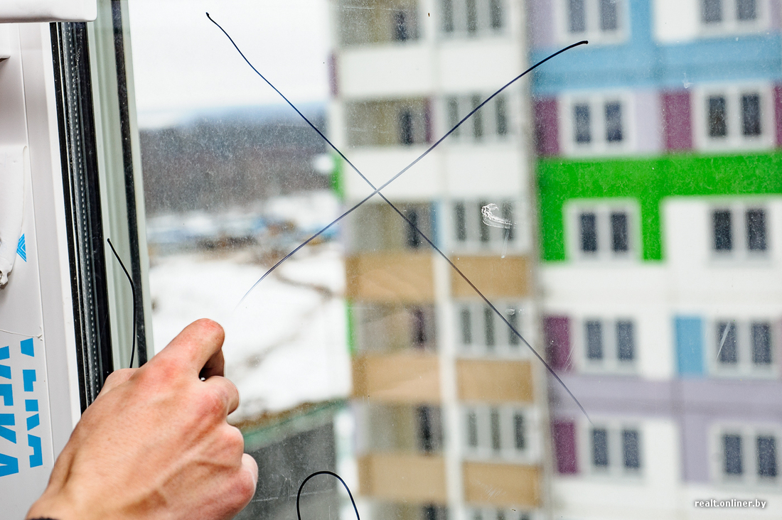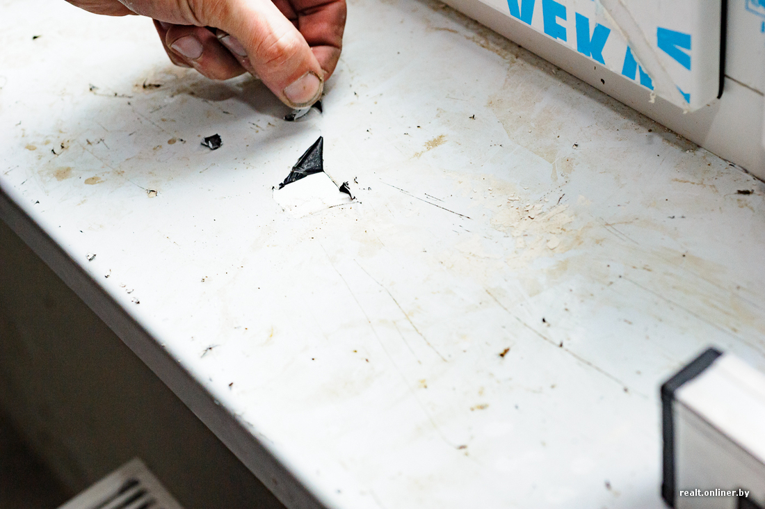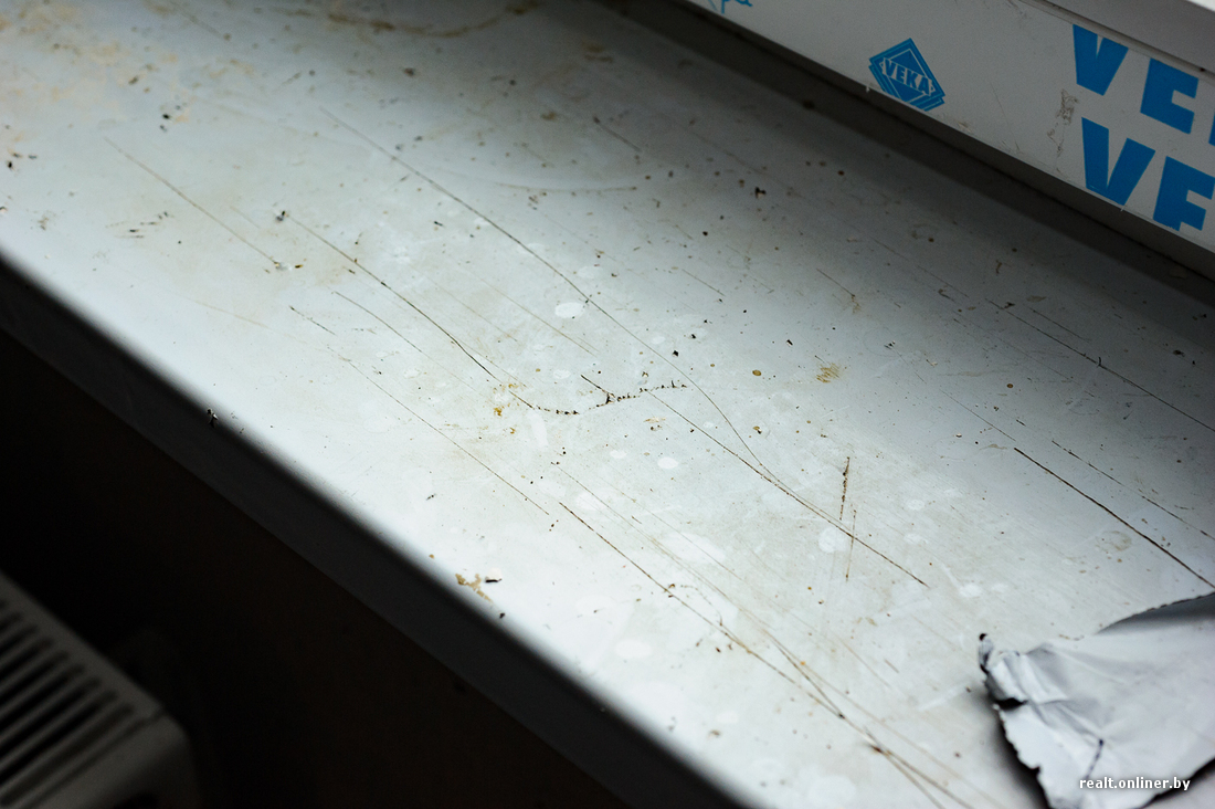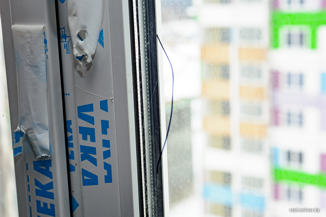 С окнами ситуация некритичная, но под замену надо бы отправить 50% стеклопакетов: на них были обнаружены царапины, пузырьки, окалина. Понадобится регулировка створок. Также застройщику придется напрячь строителей: защитная пленка с рам и подоконников не удалена. И если липкие полосы с оконного профиля снимаются легко, то пленка, оберегавшая подоконник, никак не хочет поддаваться на наши «уговоры» — полотно не отходит сплошным пластом и обрывается через каждый «протянутый» сантиметр.