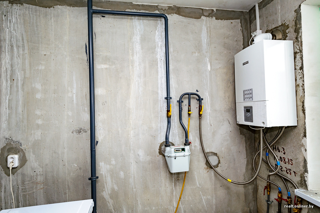 На стандартных размеров кухне у каждого жильца «Вясёлкі» живет гигантский «спрут», состоящий из хорошего импортного котла и множества труб, шлангов и трубочек. Глядя на это многообразие, голова идет кругом: достаточно представить, что данное чудо инженерной мысли придется прятать (а что-то по нормам прятать и нельзя), чтобы установить встроенную кухонную мебель. Вишенка на торте — огромный счетчик газа.