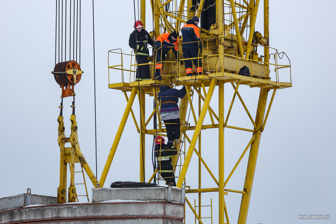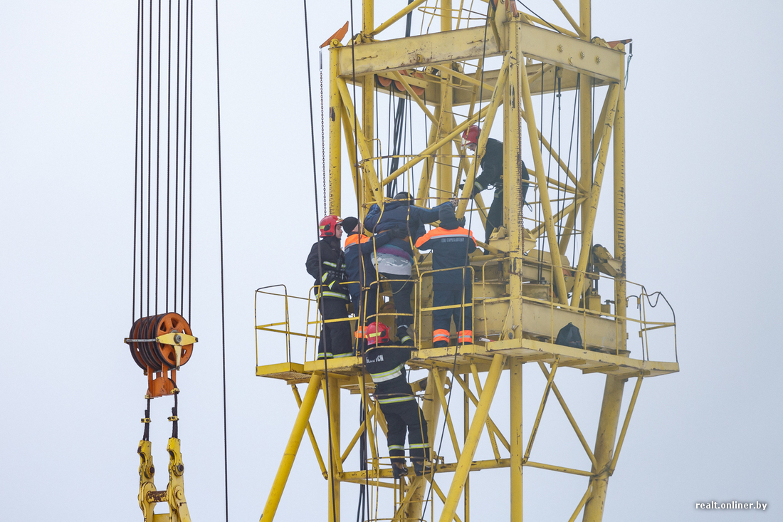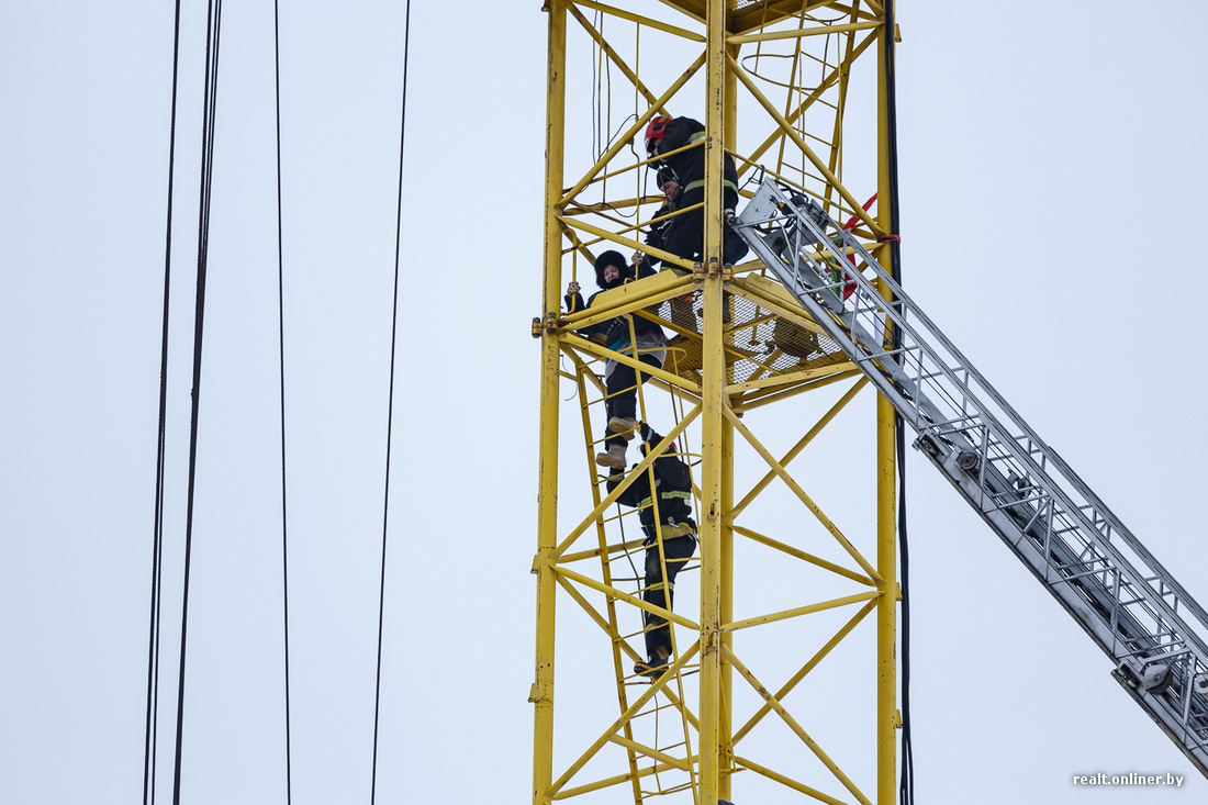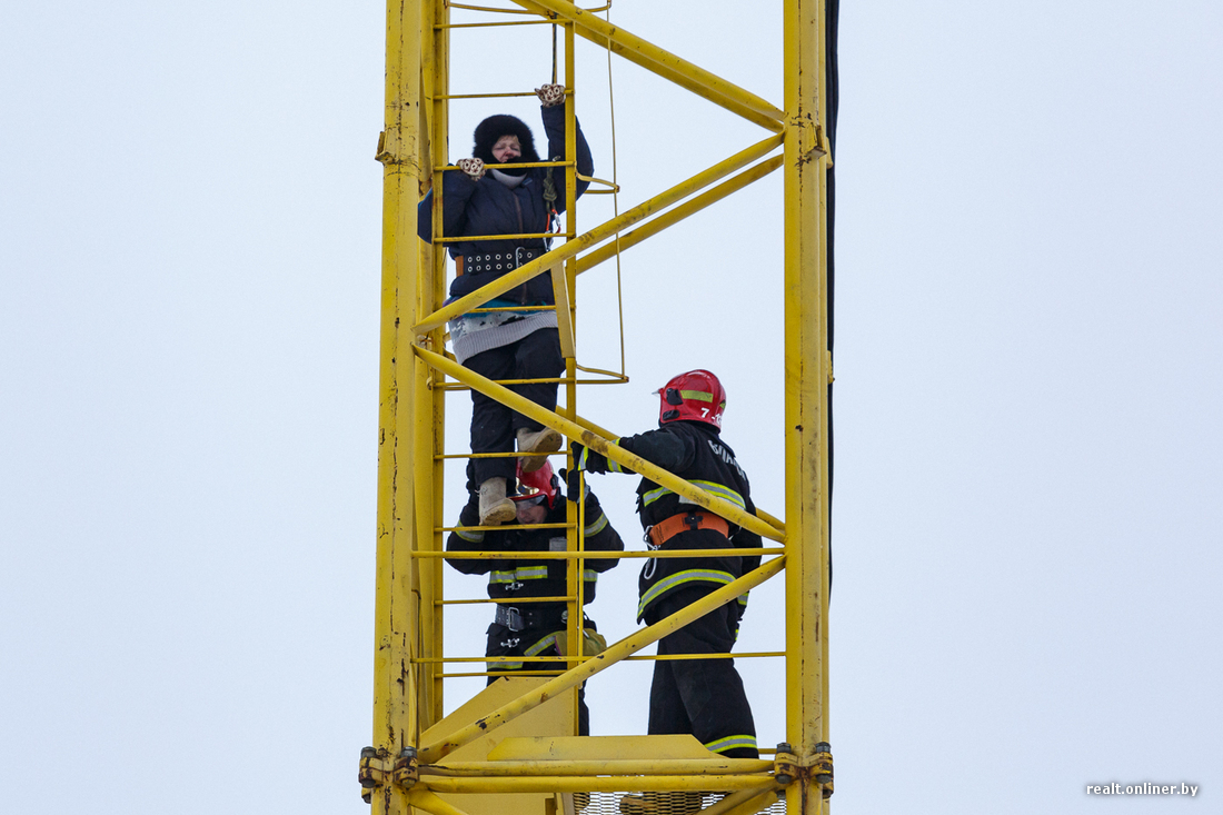 Меж тем ситуация развивается: только что несколько сотрудников в форме МЧС (11:18) и два человека в форме строителей поднялись на кран к замерзшей и уставшей женщине. Как выяснилось позже, специалисты заметили, что женщине стало плохо, и решили подняться. В форме строителей оказались сотрудники ОМОН ГУВД Мингорисполкома, передает ГУВД Мингорисполкома.