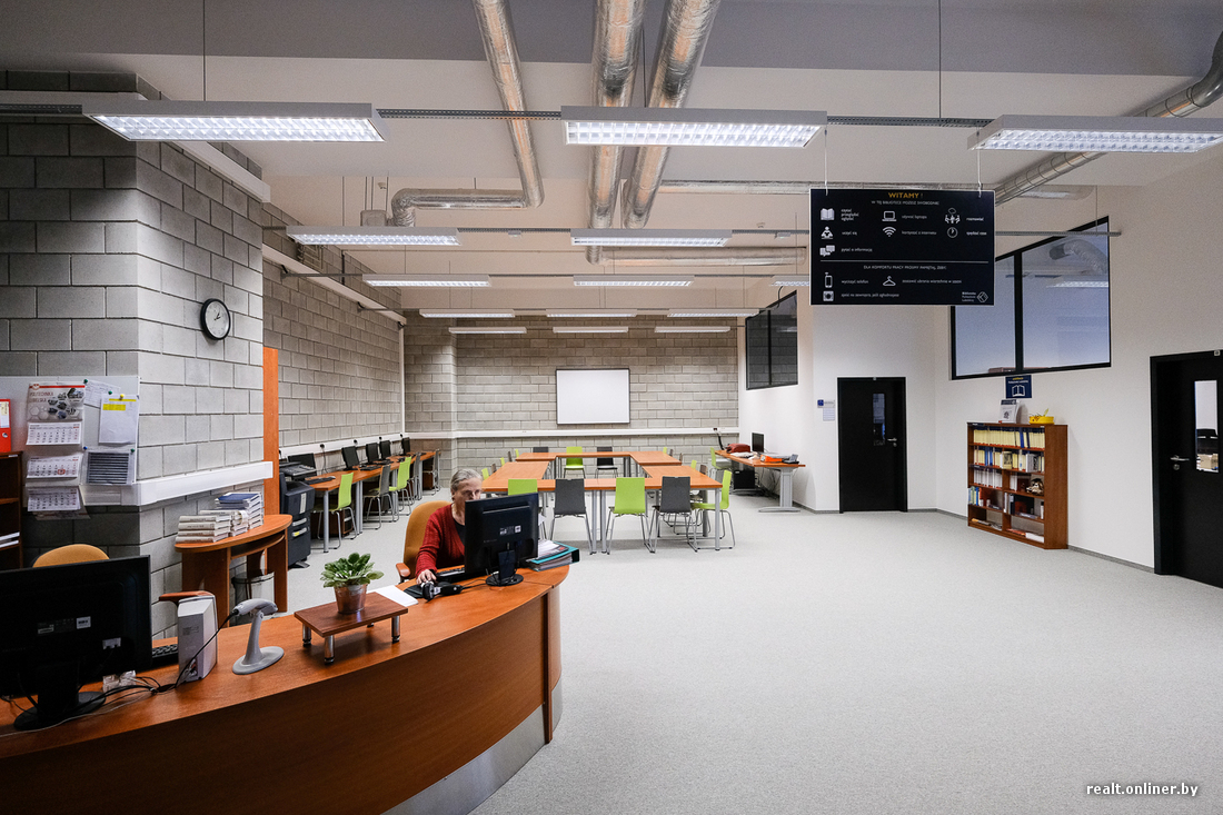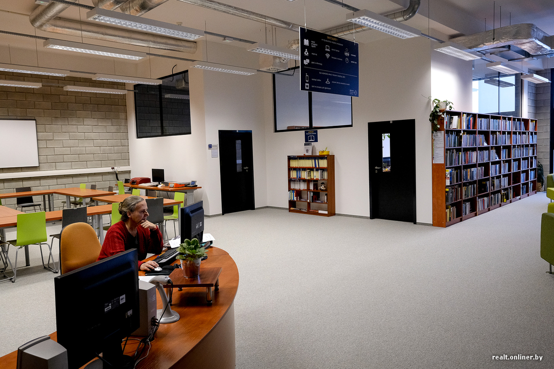 Внутри модная библиотека — как с журнальной картинки. Коммуникации под потолками по последним веяниям не закрывают, называя стиль то лофтом, то стимпанком.