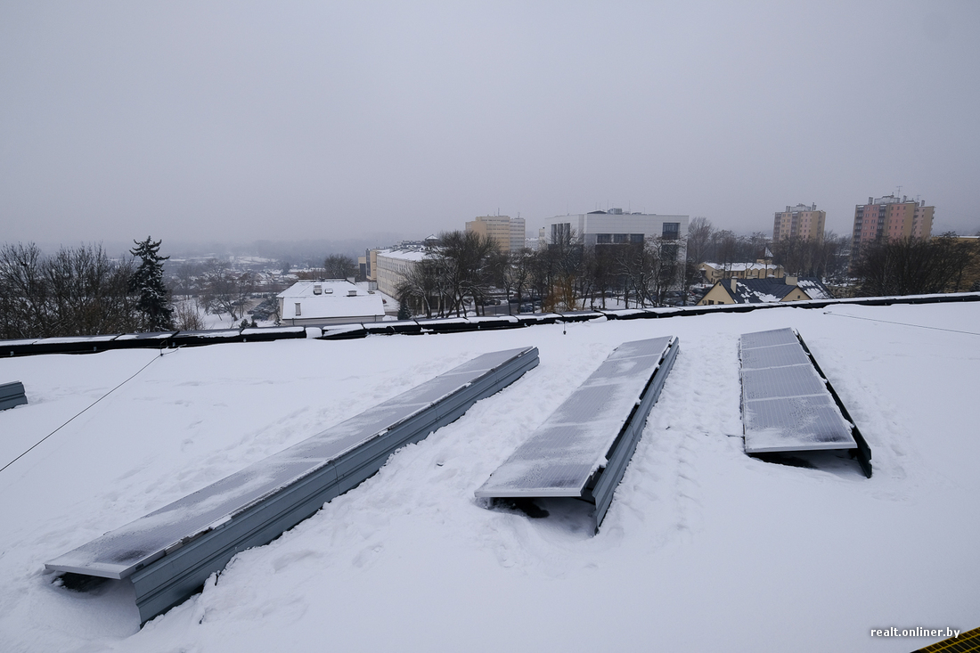 На крышах — солнечные батареи, которые летом обеспечивают здание энергией на 100%. Если верить сотрудникам, конечно.