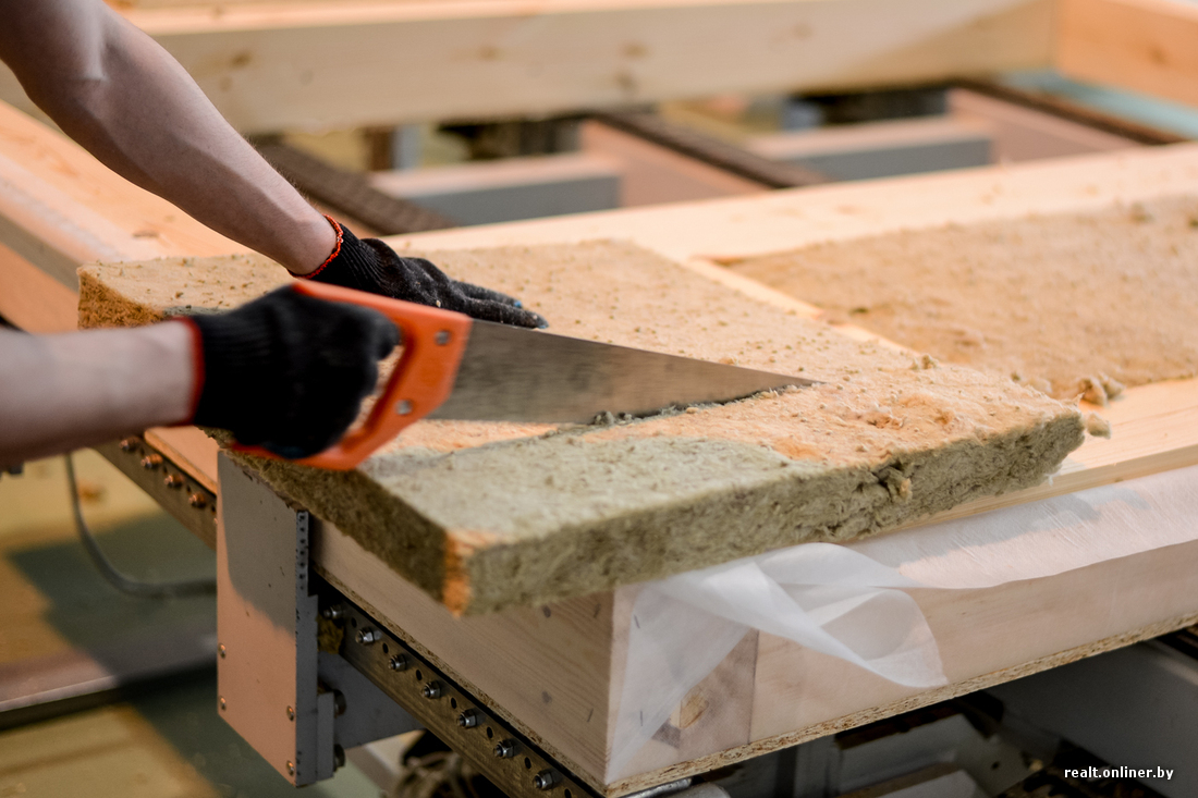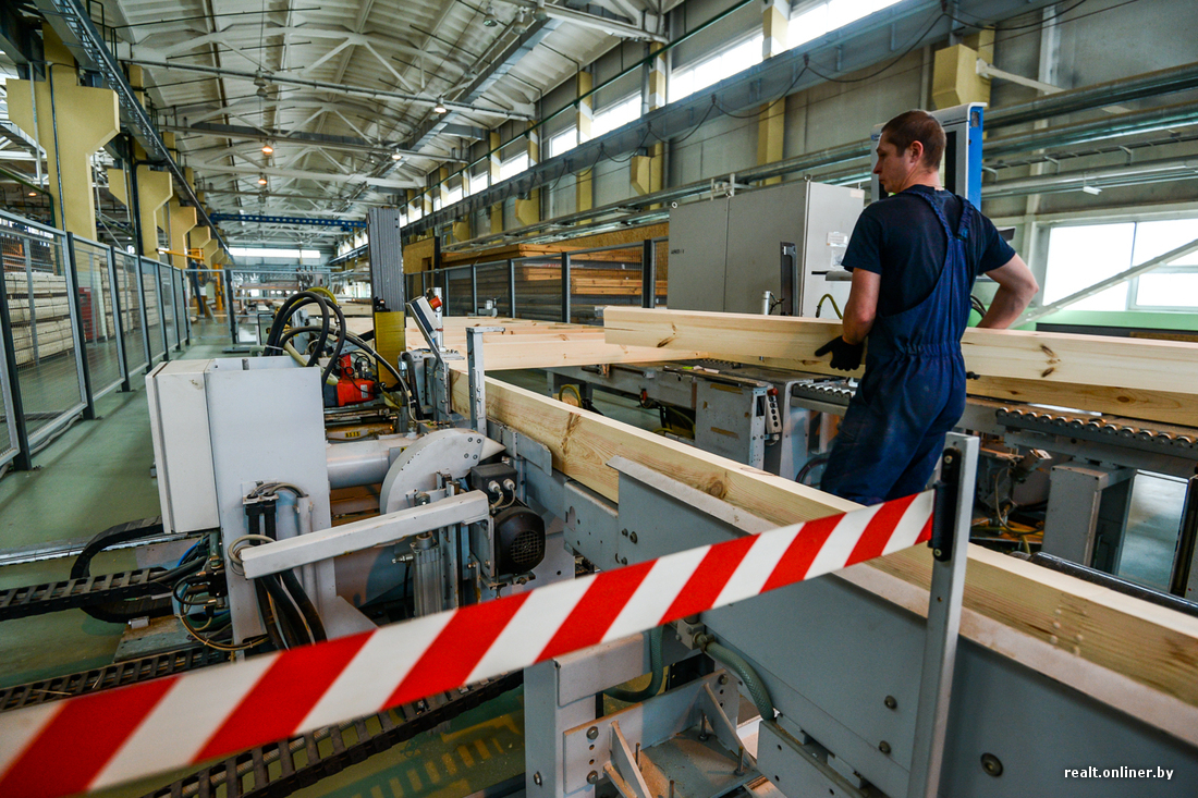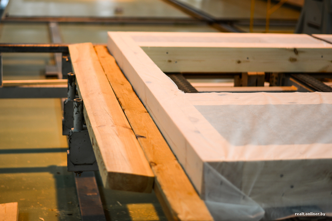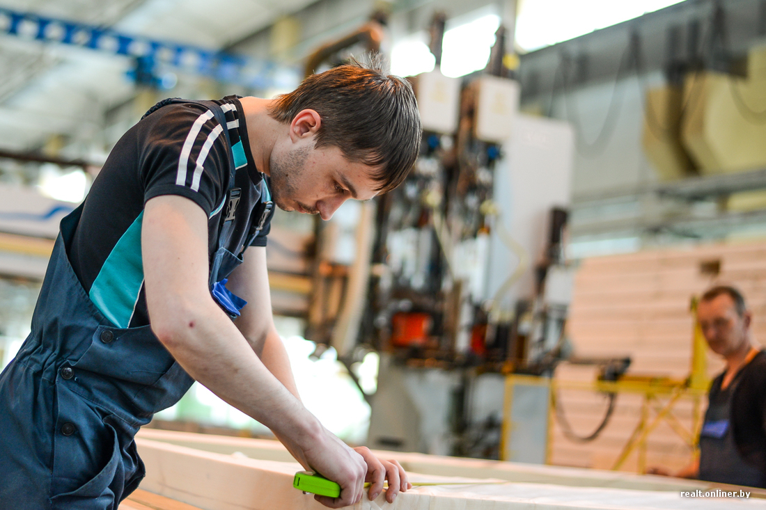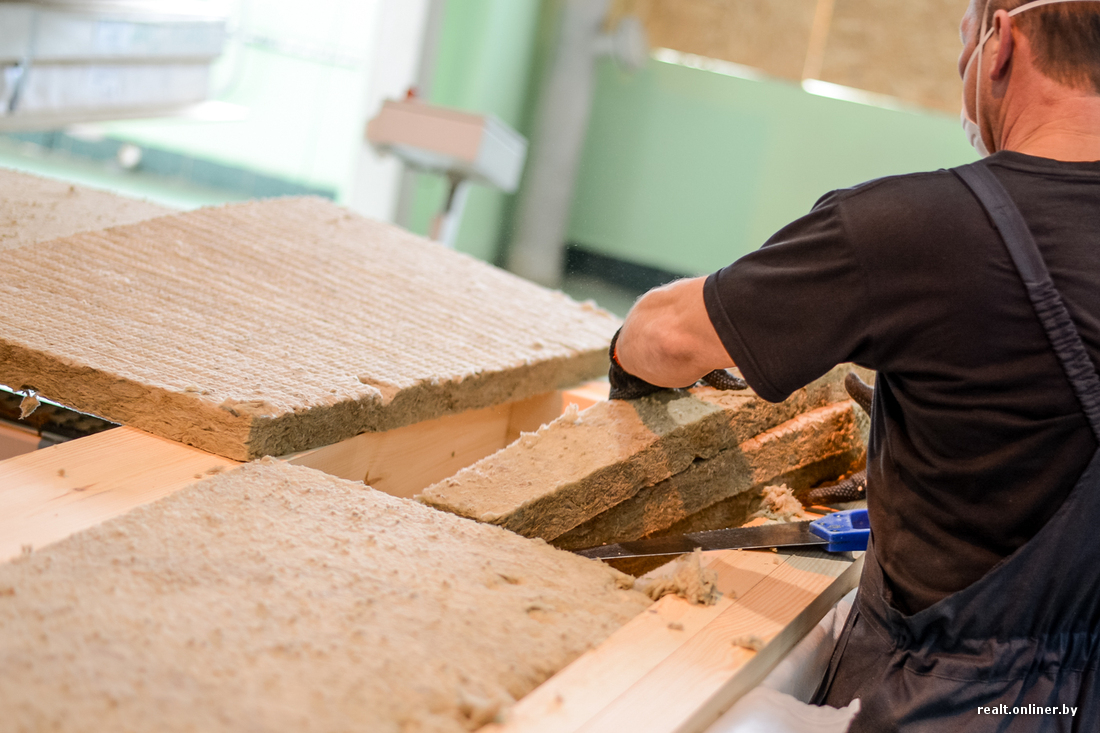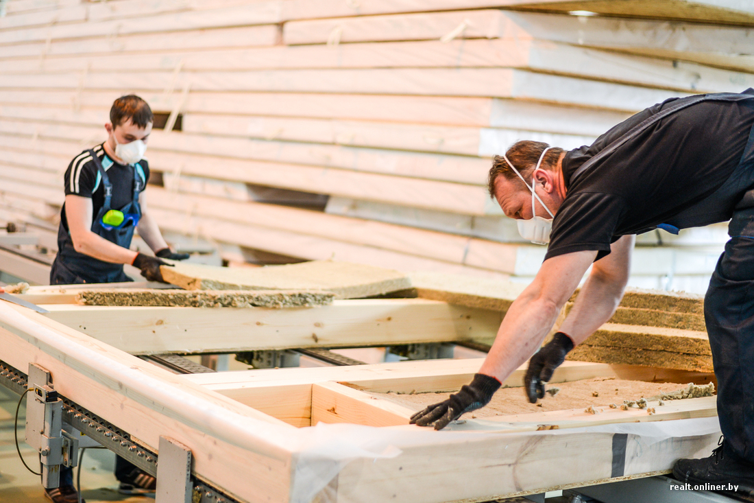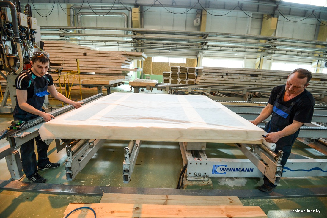 Классическая технология такова: на фундаменте сначала собирается деревянный каркас, затем промежутки между стойками обшиваются листовым материалом и заполняются утеплителем. Индустриальный же способ сборки предполагает заводское производство каркасных панелей с промышленной скоростью. Шкловское предприятие — пожалуй, крупнейший в Беларуси производитель готовых комплектов каркасных домов.