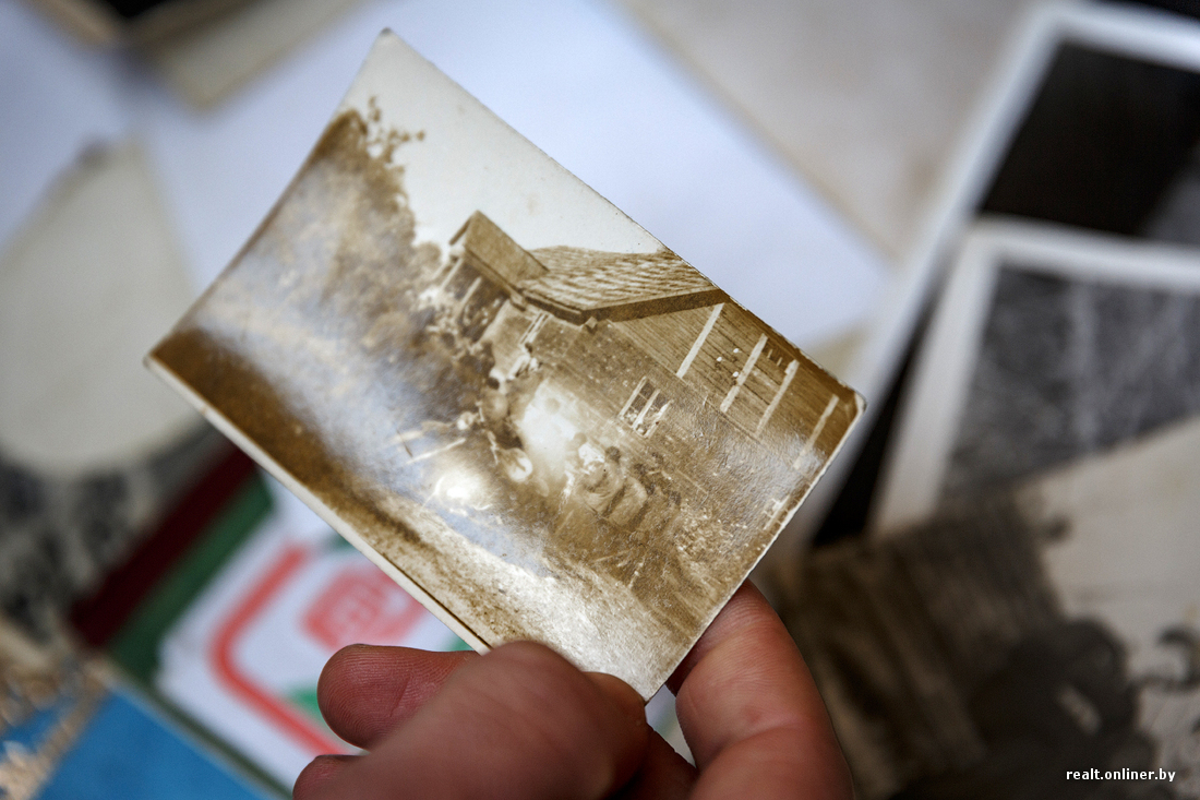 Просим Чеслава поискать старые фотографии деревни. Мужчина уходит в дом и выносит целую коробку с черно-белыми снимками и открытками.